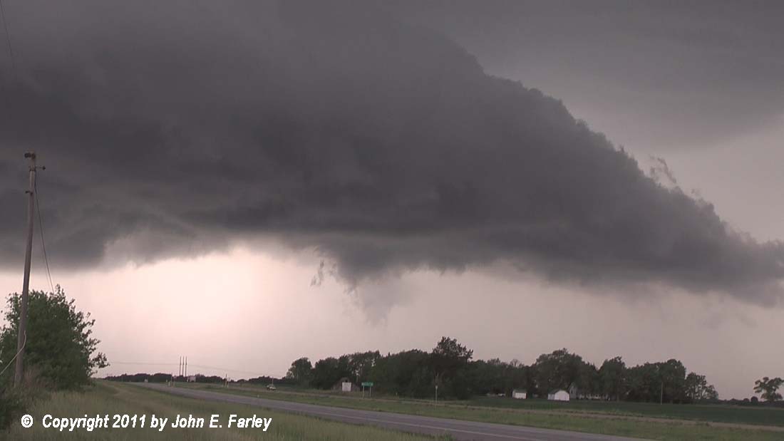 I would think, based on the damage to the home and other damage that occurred, that the peak wind may have exceeded 100 mph. The video is strongly suggestive of a microburst - note that, at the ground level, the rain, hail, dust, etc. are being blown from right to left, and ground-level rotation is not evident - although there could be a little in the cloud tags above. The TV story does mention an abrupt shift in wind direction, which might suggest a tornado in there somewhere - and I suppose that is possible, since I was 10 miles away, but the wind switch could also have been from inflow to outflow - I did notice pretty fast changes from easterly inflow wind to westerly outflow wind a mile or two ahead of the storm a couple times along route 36. In any case, it was a very violent storm, and my location to its east turned out to be a very good one for geting nicely backlit video of the surging rainfoot and lowering.