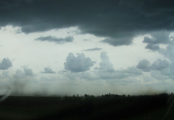 As it turns out, I saw storms along I-72 from west of Niantic, IL into the west side of Decatur similar to what several other Illinois chasers saw around that area and around Urbana. Basically I was trying to catch up with the storm from behind, with the haboob (large dust storm kicked up by the storm's strong outflow) ahead and to my right and the hail core ahead and to my left. Here are a couple pics from I-72 just west of Niantic, looking SE: