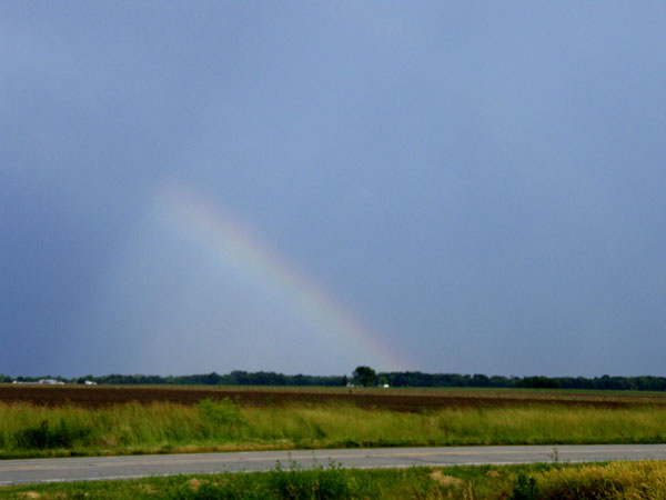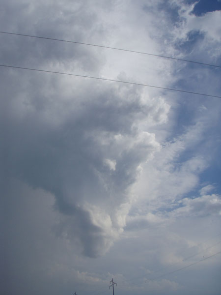 A couple minutes before these photos, the updraft pulled up some of the dust and it went about halfway up. Also, when I briefly stopped to photograph the storms at the Niantic exit, a couple fire trucks raced by to put otu a small fire I had seen south of I-72 a mile or two back, perhaps started by lightning. The dust and smoke mixed as they blew up and toward the clouds above. I caught up to the storm at the west edge of Decatur, but was running on fumes by then. (I had an art show the previous night and after taking down my tent at 11 p.m., did not think about filling my tank for a possible storm chase the next day). So, I had to stop for gas. By the time I was done with that, the storm was hopelessly ahead of me, so I decided to drop south on 51 hoping to get back ahead of the storms on the way home. Soon I saw a nice-looking storm exploding ahead of me, and it went SVR-warned and dropped up to quarter-sized hail in the Centralia, IL area. But by the time I caught up, the once-impressive updraft had dwindled down to this: