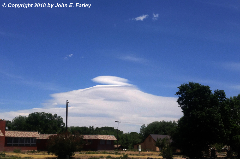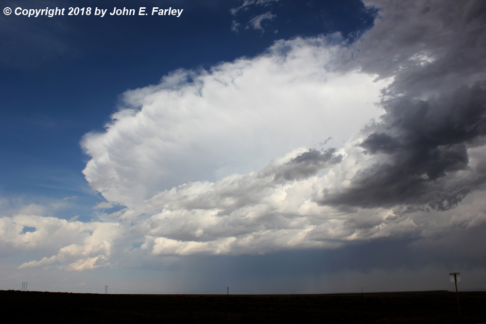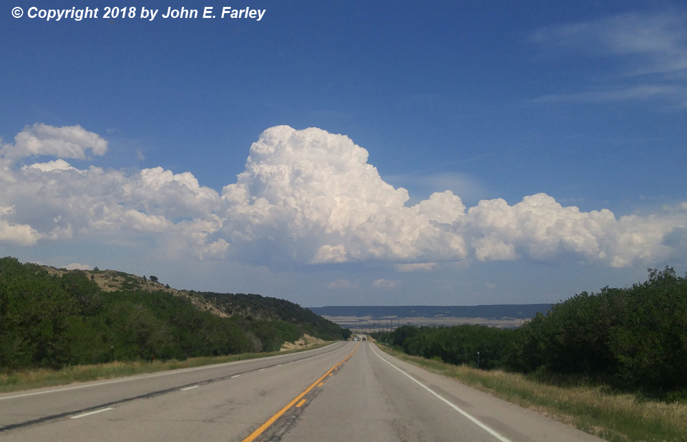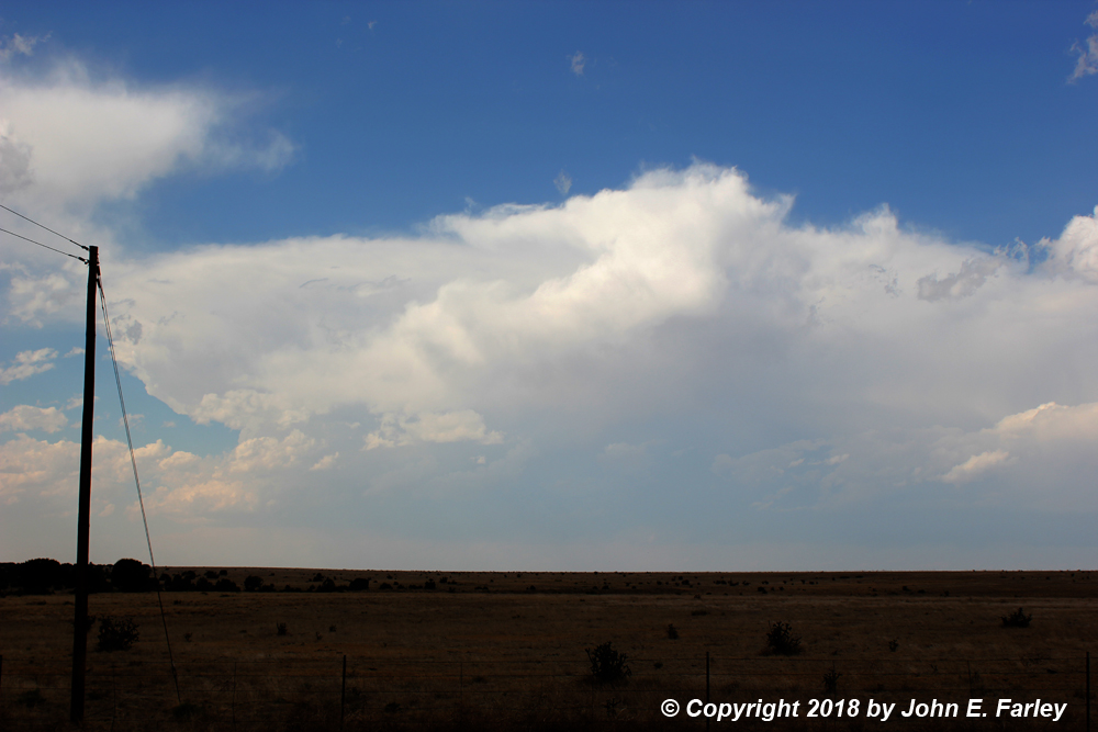 While the storms never really got going this day on the Raton Mesa, they did on the Palmer Divide. (I had favored the Raton Mesa in part because of its greater proximity to my route but also because I thought with the moisture coming in from the southeast, conditions would be more favorable there. But it turned out to be the Palmer Divide where storms really got going.) Those storms were moving to the ESE, with the tail end of the line north of La Junta. So I now figured I would have a play on these storms along my way to Lamar.