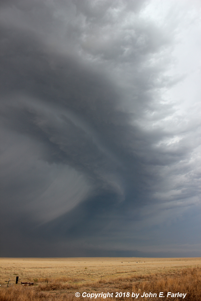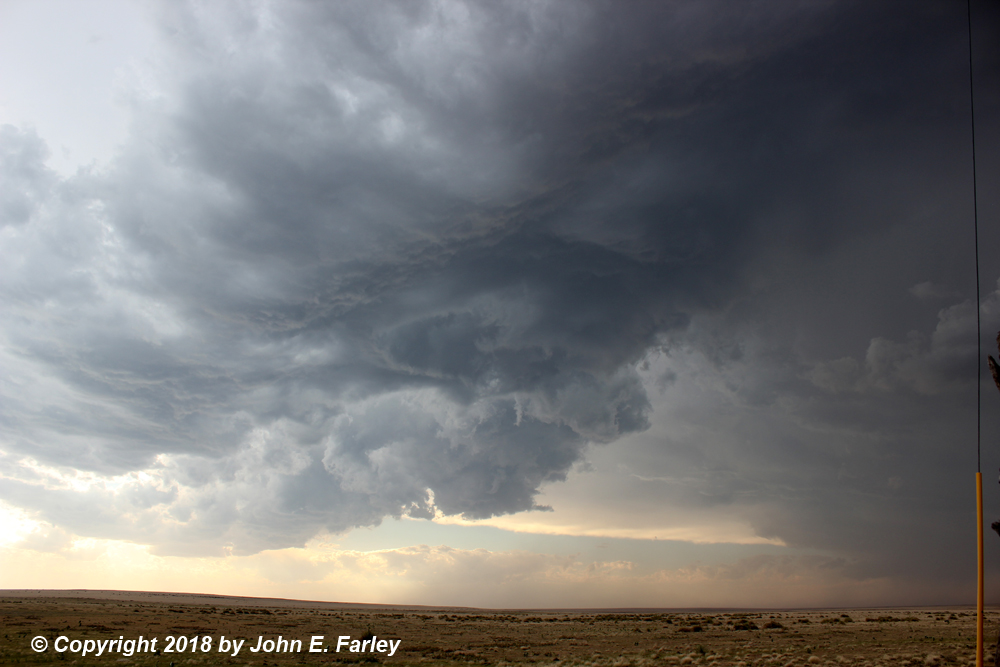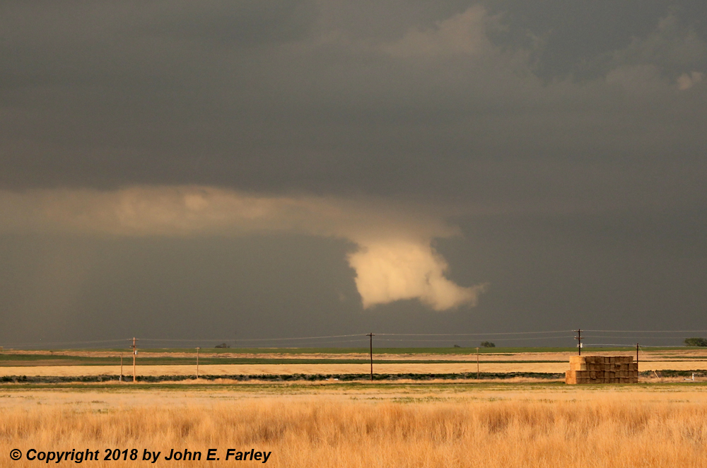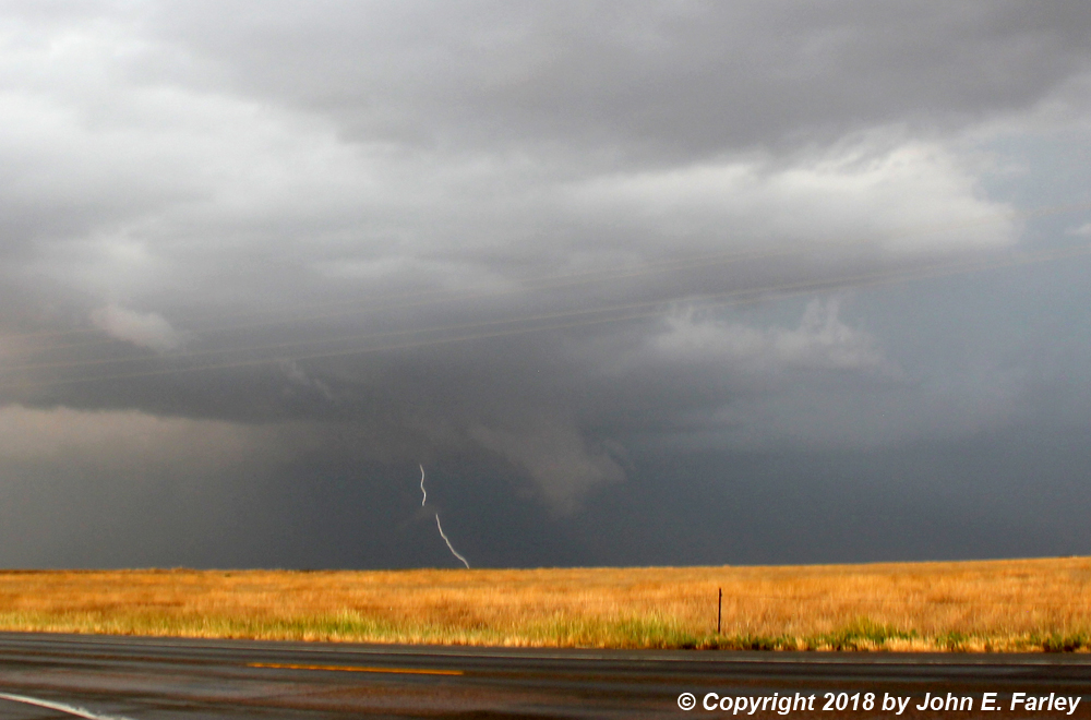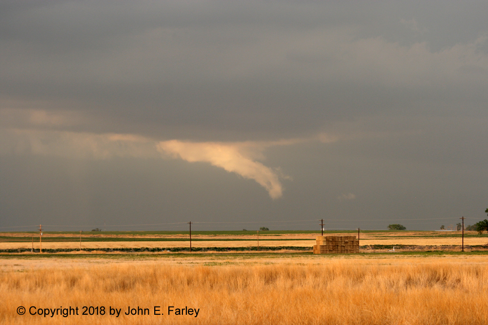 6:30-7:00 - I head north on a north-south road that intersects US 50 a little east of Las Animas, CO. This will take me to the tail end storm of the line of storms that initiated on the Palmer Divide. Both this storm and another one to its east, north of Lamar, are SVR-warned. I see the meso of this storm to my northwest as I head north, and there even seems to be a brief needle funnel under it: