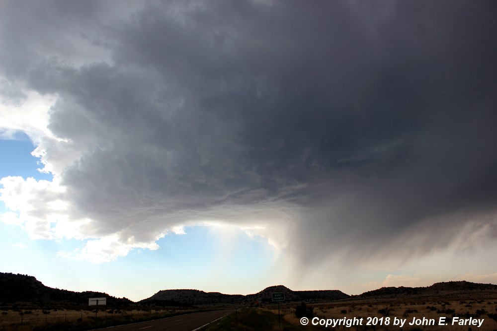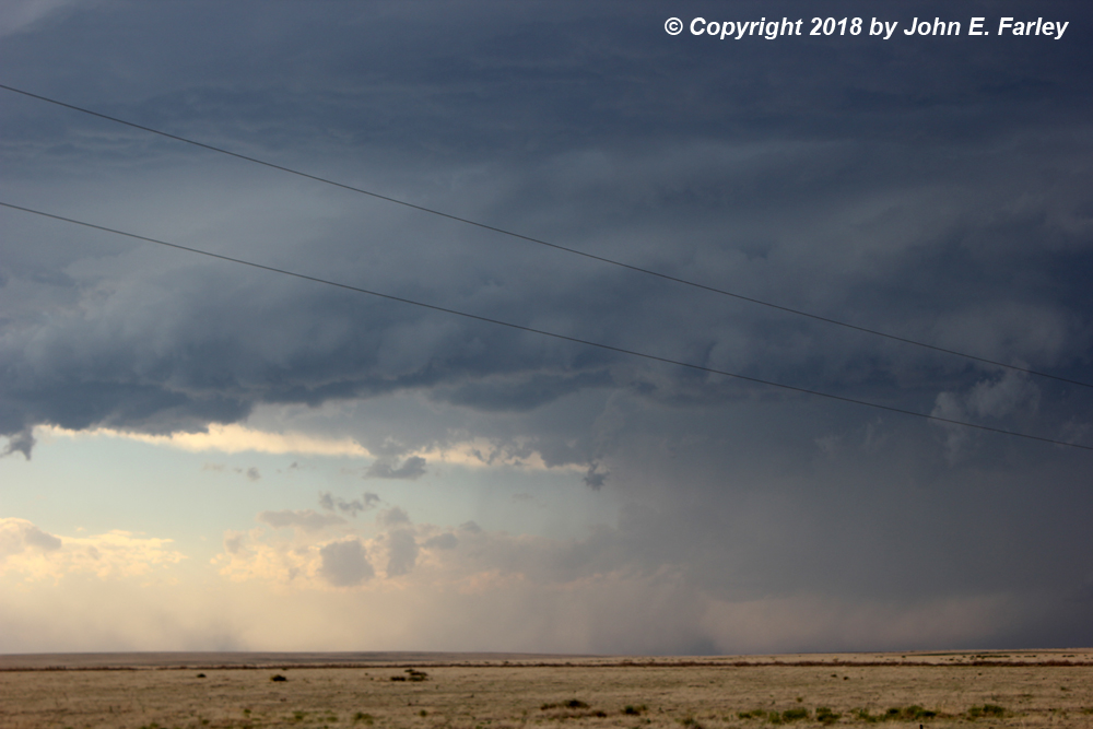 5:00-5:45 - The Rocky Ford storm looks rather weak and LP-ish, but is rather pretty at times. Since I can intercept it between Kim and La Junta and since that is on my way to Lamar, I head north from Kim for an intercept. The storm has some narrow rain/hail shafts, and I stop a few times for photographs. I intercept it 10 miles or so south of La Junta as it crosses the road ahead of me: