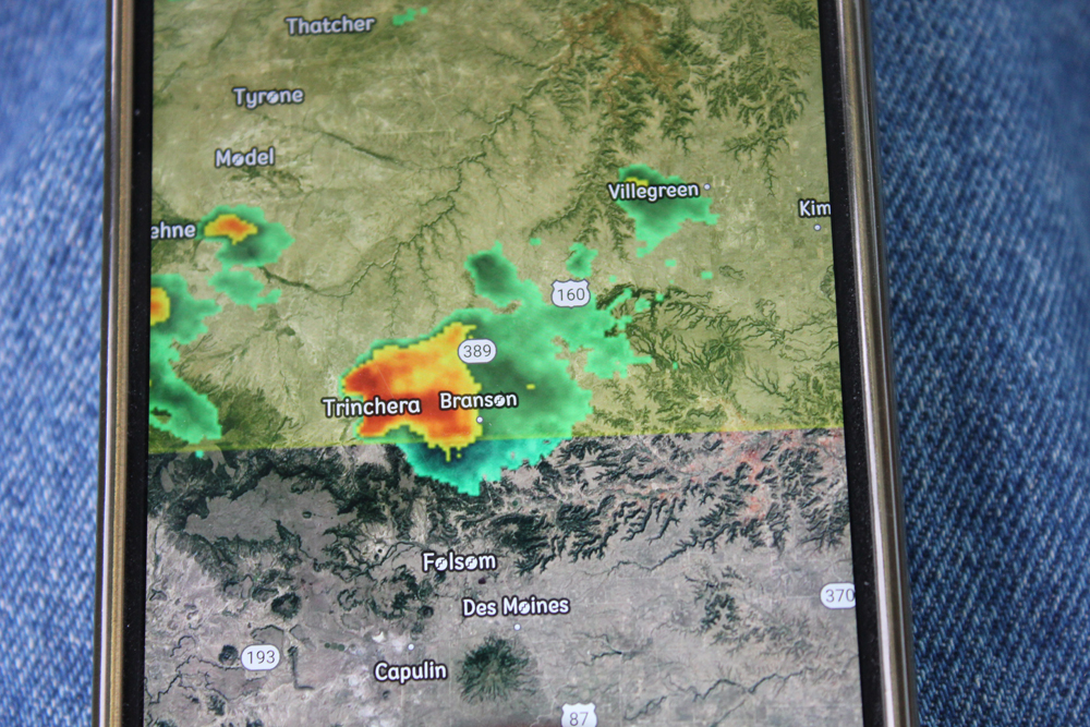 3:50 - southwest of Kim, I can see a storm - likely an LP supercell, to my southwest, coming off the mountains SE of Trinidad.