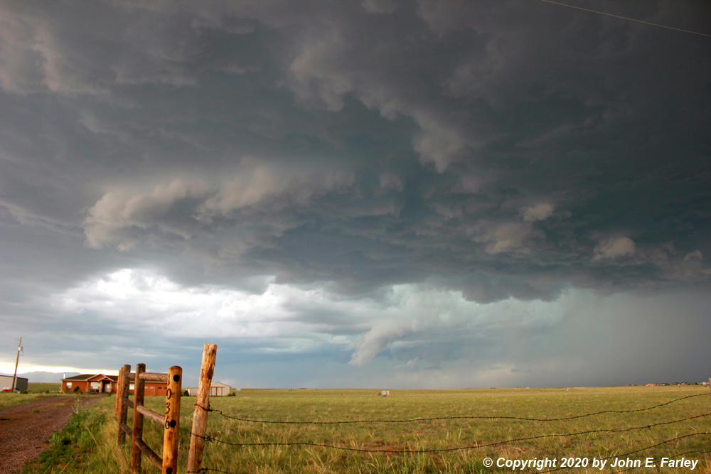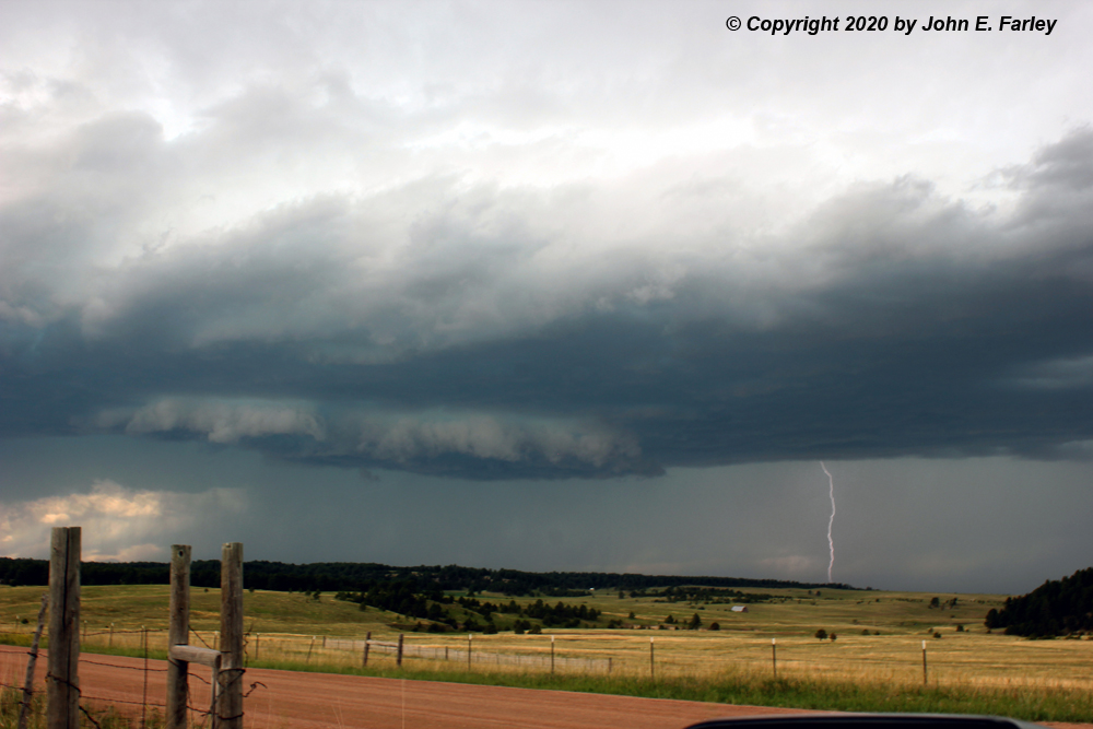 3:00 - By around this time, I was on the storm NW of Peyton, near the El Paso/Elbert County line. The storm, to my NW, had by now had three SVR warnings from the BOU NWS for areas such as Castle Rock, and including Elbert County. The storm seemed to be building to the SW as it tracked SSE from the Castle Rock area, briefly forming a wall cloud a bit down the line SW of the main core. After a little while, the area around that wall cloud filled in with rain and hail and the wall cloud disappeared. A SVR warning was issued for NW El Paso County at 3:20 until 4:00 p.m. by the NWS in Pueblo. I was along and eventually a mile or two west of Elbert Road, northwest of Peyton and south of Elbert. Gradually, I could see to my NW what I at first thought was a shelf cloud but as it got closer I determined that it was actually the meso, as the storm had taken on something of an HP character - there was heavy precip behind the lowered area and both to its left and right. Here are a couple pictures, shortly after this feature came into view and a little later with lightning as the feature surged to the SSE: