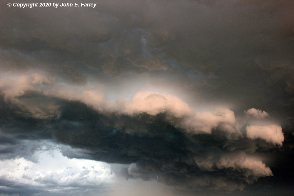One thing that made this storm so photogenic was the colors in the clouds. Often the deeper part of the clouds displayed the blue-green color one often sees in hail-producing storms, and the ambiant light at times gave the lowered areas of the cloud base a pinkish color. Here is a good example, shortly before the second tornado warning expired: