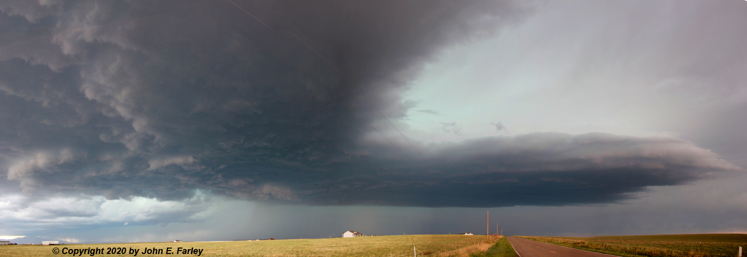 A few final thoughts. One interesting aspect of this storm was the very pronounced beavertail feature that it had for much of its life. During much of the chase I was near or underneath it, so I was not real conscious of it, thinking it may just have been updraft base from its appearance from underneath. But it was very noticeable near the end of the chase when I got a little more ahead of the storm, and in looking at my pictures I could see it was also evident when I first got on the storm, while it was still pretty far away. Here are two panorama photomerge images, the first from very near the beginning of the chase and the second from near the end. The beavertail feature is quite evident on the right-hand side of both pictures: