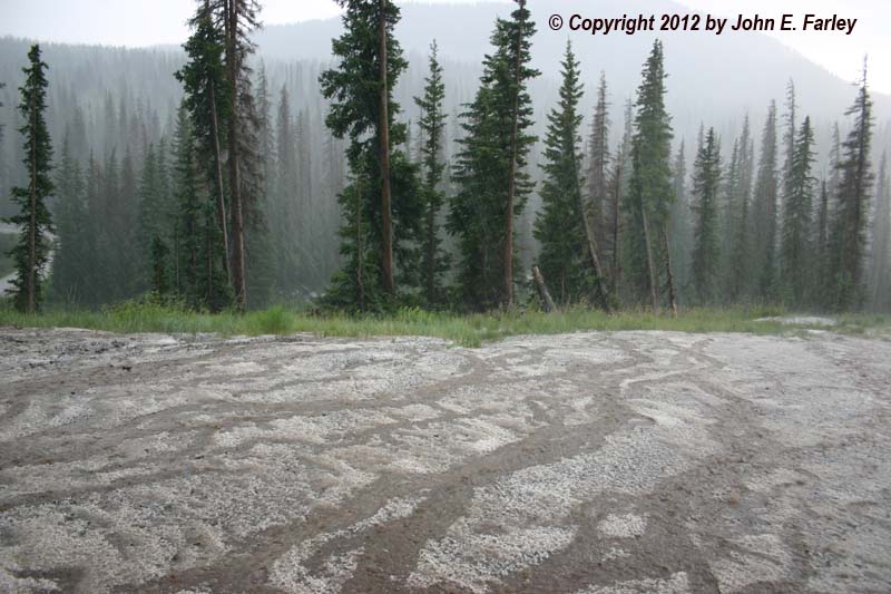 Hail accumulation on turnout 2 or 3 miles SW of the summit.