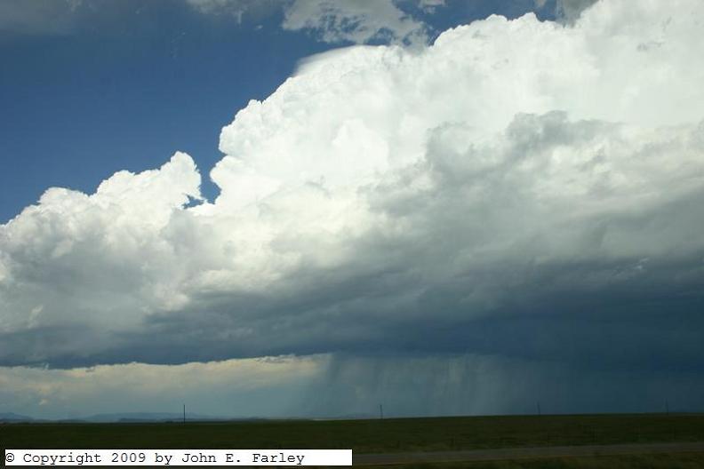 It was now around 3 p.m.; I was about 15 miles northeast of Las Vegas and 5 southwest of Watrous. The storm formed a pileous cap under its newest tower, had a lot of CG lightning, looked like it had some hail, and after a while briefly took on somewhat the appearance of a supercell: