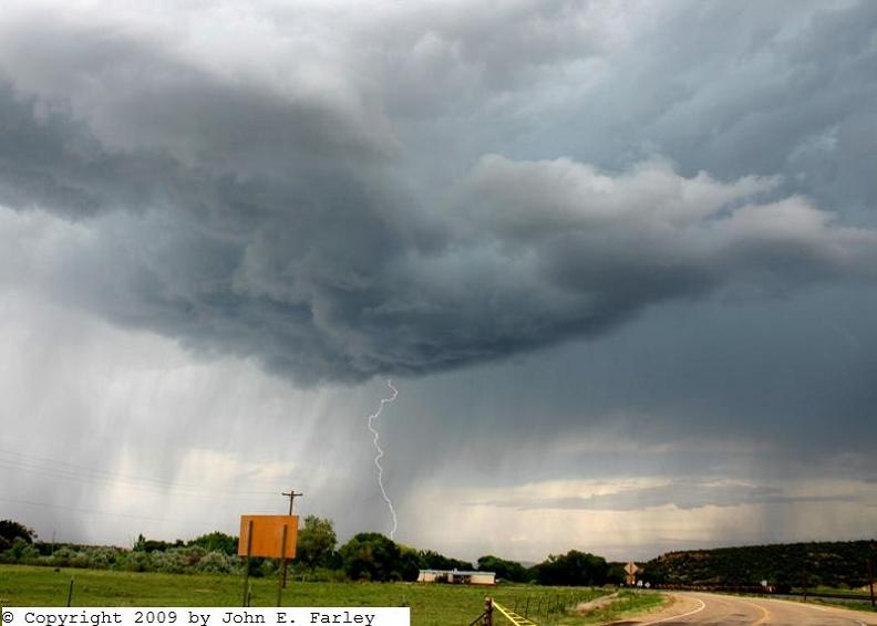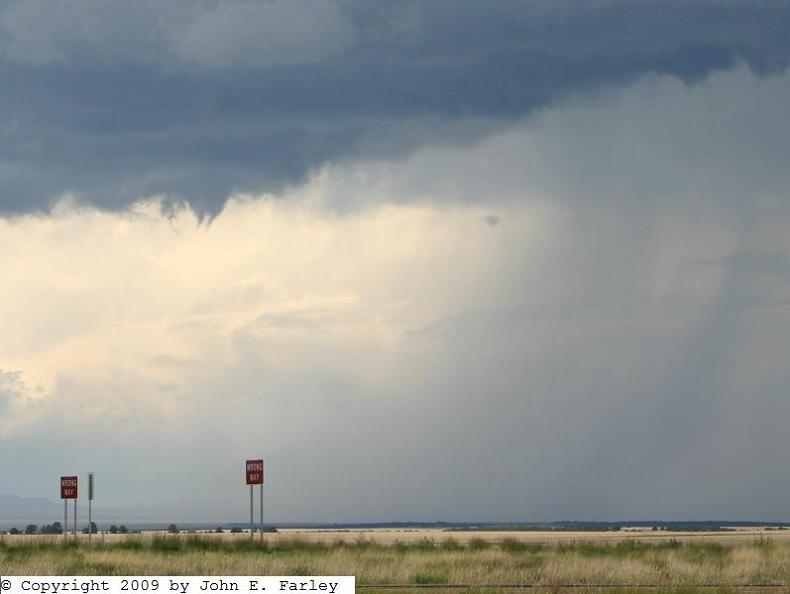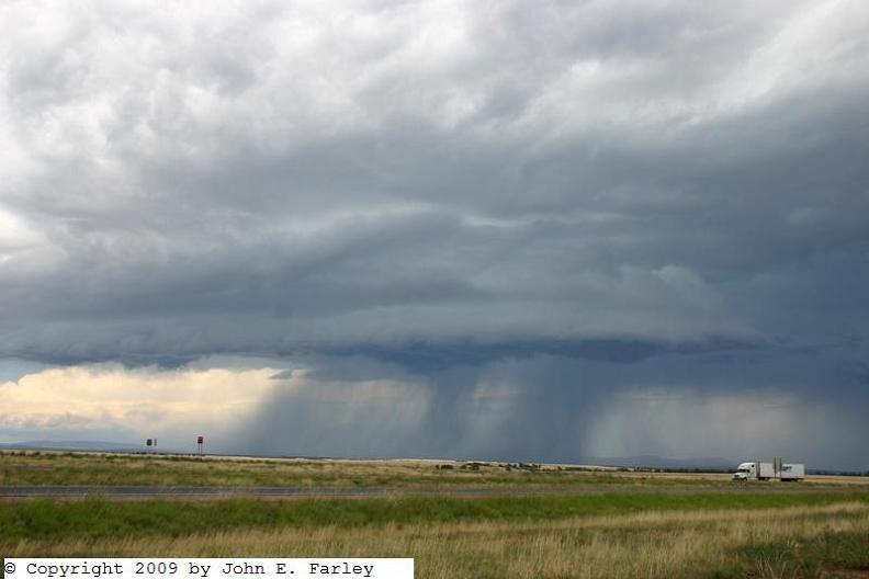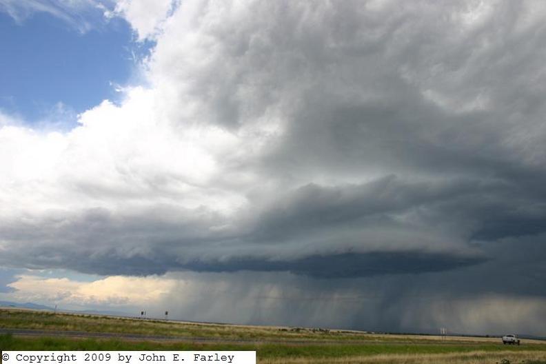 All this was enough for me to deviate from I-40 and take the northern route from Tucumcari to Las Vegas via Conchas Lake. I could see the storms well off to my north and northwest; being in an area with poor data I did not even hook up the computer until I got into an area with better data. When I got to Las Vegas it was obvious that I needed to blast northeast on I-25 and that I could reach the storms within 20 miles or so. After about 15 miles I was nearing the storms and came to one of those "no facilities" rest areas so common in the West - but it had a great view of the storm so I stopped there, got some pics, and fired up the computer. I was pleased to see that the storm I was watching had a SVR warning on it, as did another one farther north near Raton.