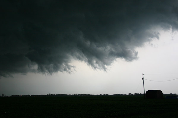 As I blasted east on a back road from Brighton toward Bunker Hill, I was right on the gust front and the shelf cloud was directly above me, with darkness and heavy precipitation behind me. The wind was fairly strong and I was nervous about the trees along the road possibly blowing down, but luckily the most intense winds were behind me in the rain. I stopped briefly to photograph the shelf cloud and the scud fingers along its leading edge, looking northeast roughly toward Shipman: