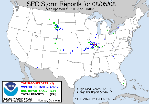 UPDATE, 8/8/08 - The National Weather Service in St. Louis has now issued a public information statement on their damage survey in the area I chased (link below). The survey showed a wide area of straight-line wind damage from Jersey County across Macoupin County into parts of Montgomery and Bond Counties, with localized areas of greater damage caused by mircobursts. One of these, with winds estimated at 65-75 mph, hit Jerseyville, with damage east to just north of Brighton (in other words, it was a few miles west of me when I reversed direction east of Jerseyville, and would be just to the right of my view in the photo from Brighton, above), and others occurred south of Shipman (where the 71 mph gust was measured) and south of Bunker Hill, in the area where I saw the branches down. (Apparently there was also a tree down on a house in this area, but I did not see that.) Another intense microburst hit farther east in the Mt. Olive area.