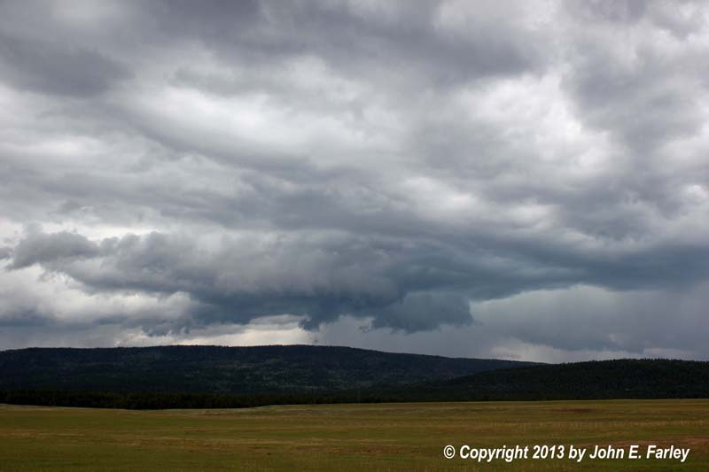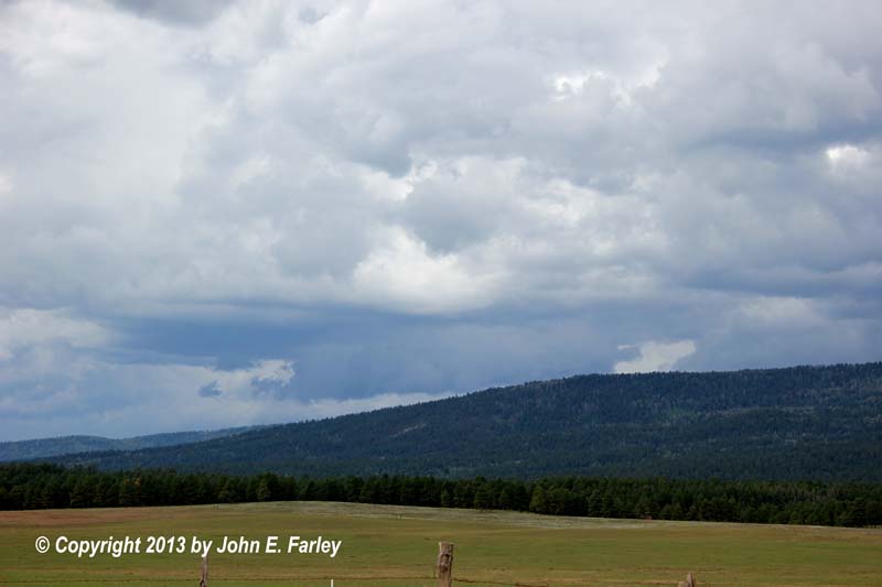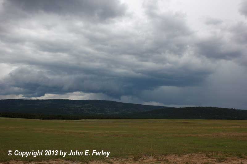 When I got home - another 5 miles or so southeast to near route 160 - my wife said that there had been no hail, and there did not appear to have been nearly as much rain, either. However, a steady light rain with occasional rumbles of thunder gradually increased over the next half hour, with more strong gusts of wind. My guess was around 35 mph to possibly 40 mph at our house, but in the town of Pagosa Springs, 4 miles to the ENE, a gust of 52 mph was measured, and I later noticed a couple trees down along route 160. All in all, this storm was quite a bit more than the normal monsoon storms, and a pretty good chase for only 25 miles or so of total driving.