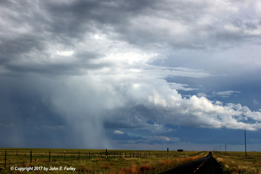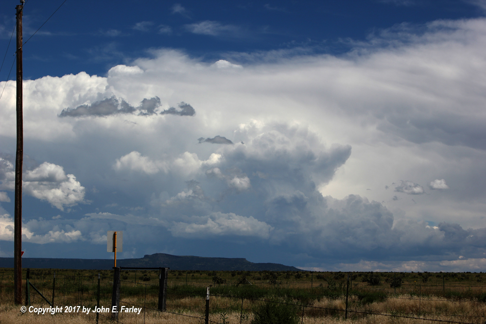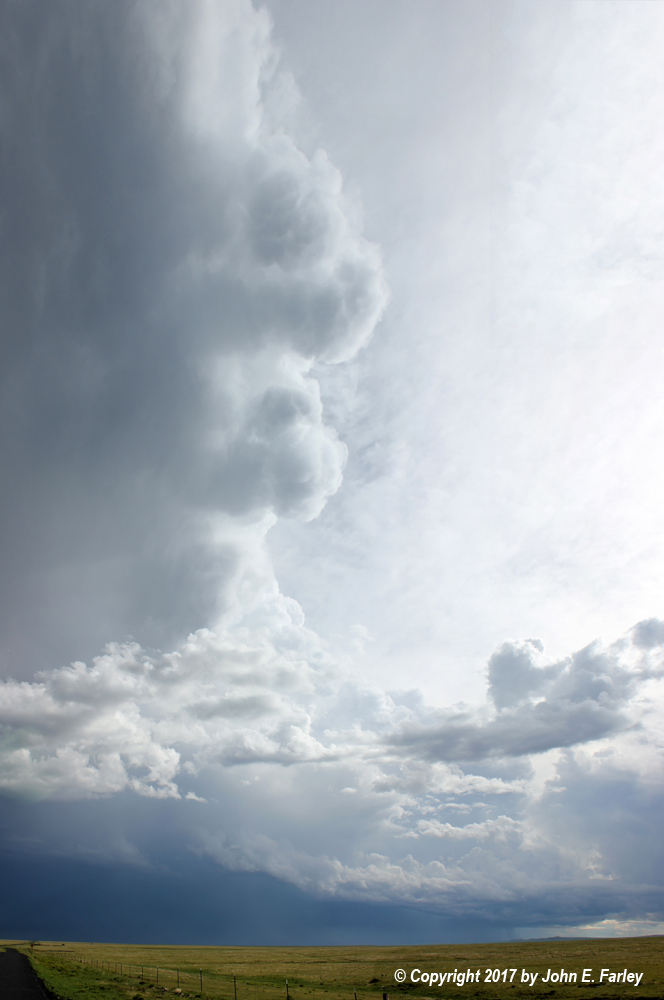 After I watched Storm 2 for maybe a half hour, it seemed to be weakening, so I decided to work my way south to Capulin to see if I could gain position on the main line of storms, which extended basically from the initial cluster of storms in a broken line SW to a SVR-warned storm around Wagon Mound, well to my SW. By the time I got to Capulin a SVR warning had been issued for two storms, one to the SSW of Greenville, NM and the other to the ENE of that, west or SW of Clayton. This SVR warning was issued at 4:19 p.m., valid until 5:15. I thought I could get to the closer storm, SSW of Greenville, so I blasted east then SE on U.S. 64 to Greenville then south on NM route 453 until I was within 10 miles or so of the storm. There I got several pictures that photomerged nicely into a wide angle shot of the storm, along with one of some in-cloud lightning it produced: