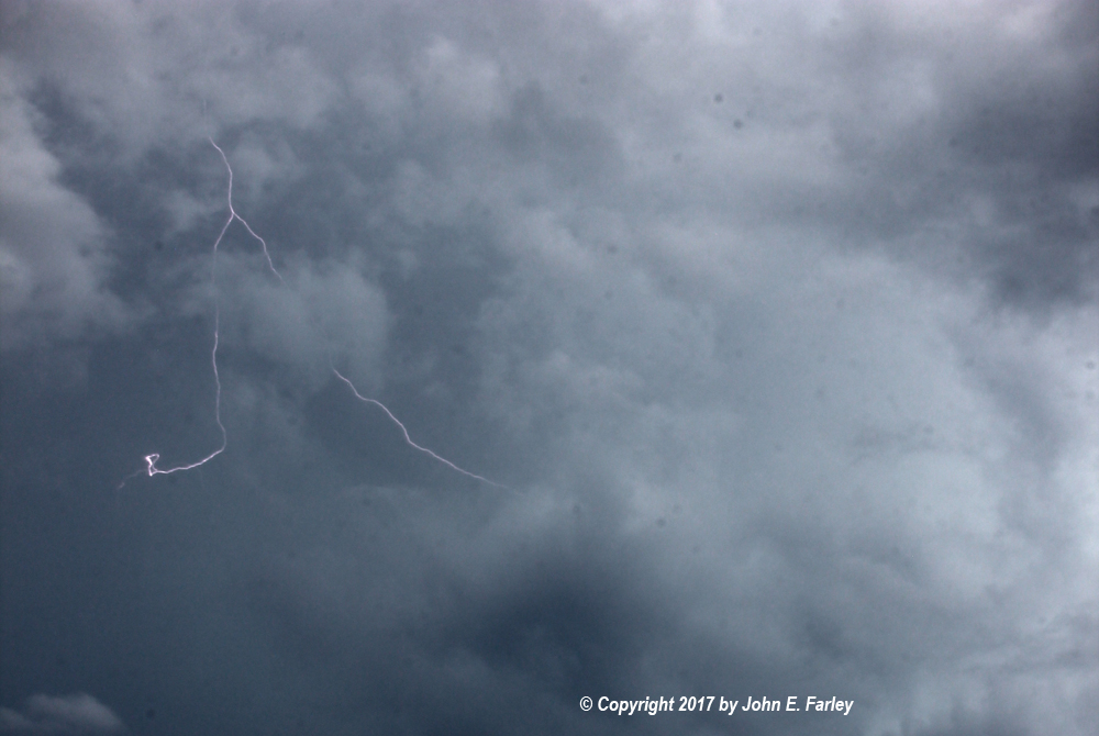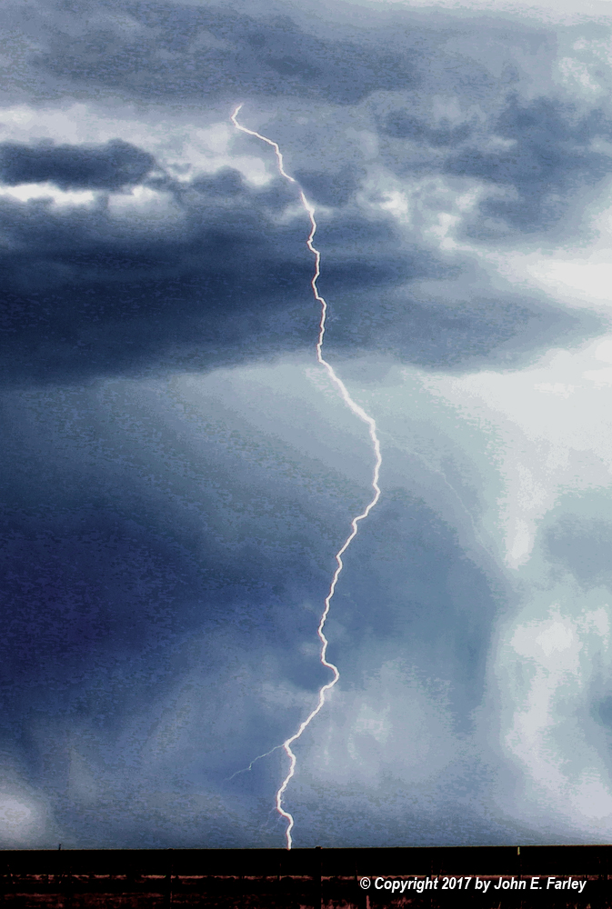 This (above) is one of the ones with both lightning and the rainbow. The rainbow is not bright, but it is definitely visible on the right-hand side of the picture. If I had stopped a little sooner I might have done better, as I saw a bolt of lightning that appeared to go right through the rainbow, just before I stopped and got the first of the pictures above. Eventually as the storm continued southeast, I got an image of a bolt right in front of brightly sunlit rainshafts. Since I had not adjusted my camera settings for the brightening conditions and was using the lightning trigger which requires a relatively long (1/10 second) exposure, the picture was badly overexposed. Couldn't really fix it so it looked natural, but I ended up with this which I think has kind of an artistic, painting-like look to it: