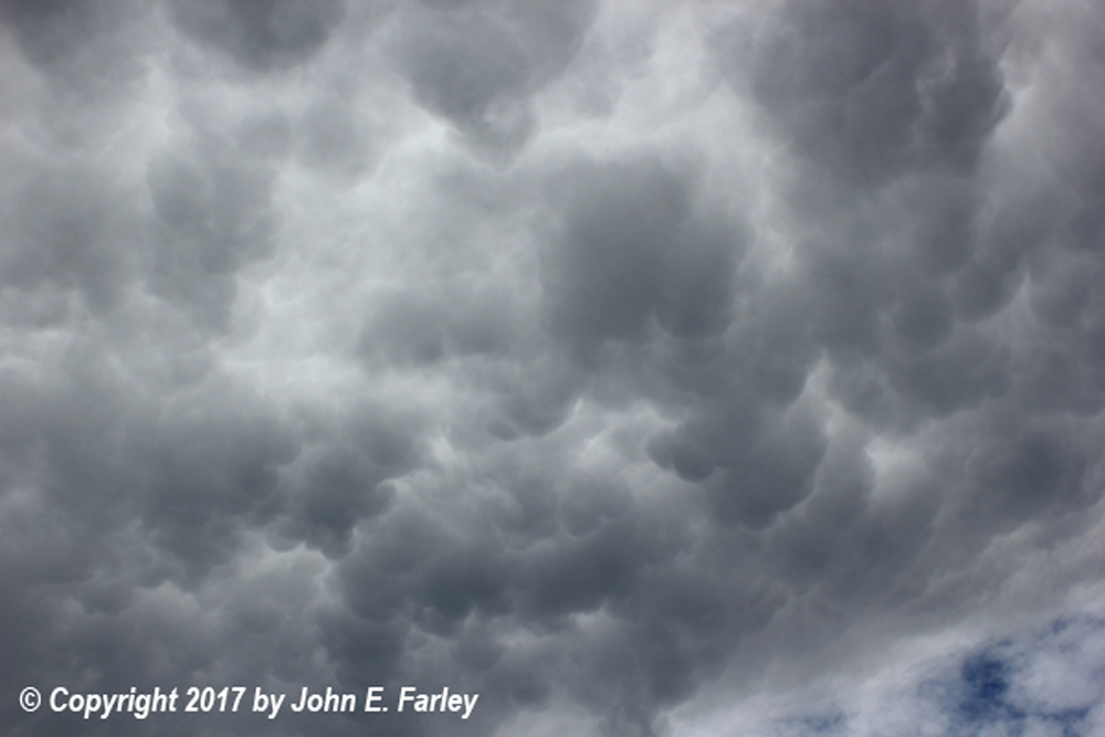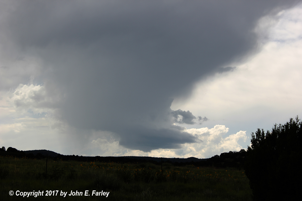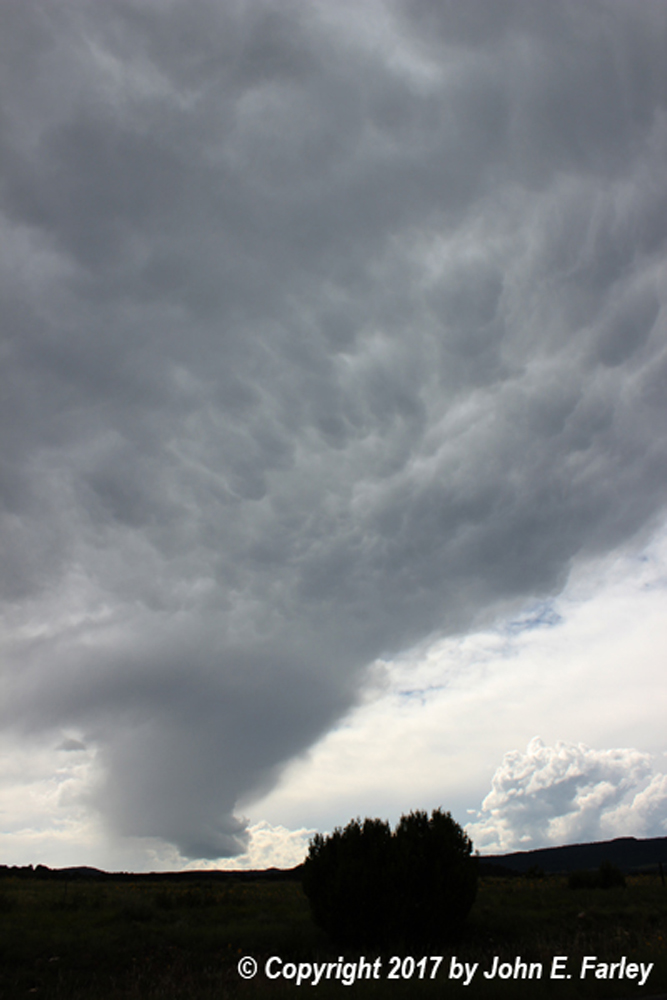 This storm hung out for hours over the western part of the Raton Mesa, perhaps 10-20 miles east of Raton. By the time I made it back to NM route 551 (the continuation of CO 389 after it crosses into NM) I could see it was taking on some nice LP supercell characteristics, so I returned back north almost to the CO state line, found a clear spot, and watched the storm for a while. There was, for a while, some decent motion in the base of the updraft - probably rotation but too far to tell for sure. With the storm having been going, pretty much in the same place, for 2-3 or more hours, its anvil stretched eastward all the way across the sky, and at times had some pretty decent mammatus underneath. Despite its evident LP supercell character, the storm never had a SVR warning and never appeared to be overly intense, though I would imagine it produced some hail somewhere up in roadless areas on the mesa east of Raton. Here are zoomed and wider-angle shots of the storm, taken looking basically west from route 551, as well as a view of the mammatus it produced: