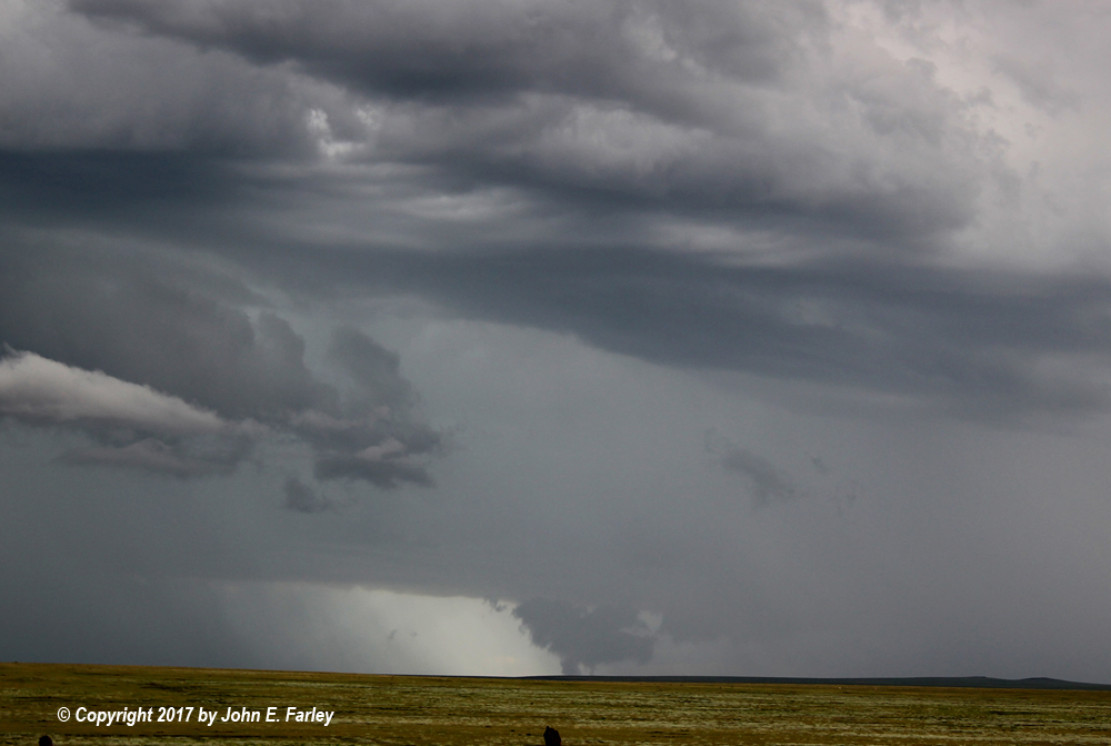 This picture was taken around 2:20 p.m., when this storm was near the CO/NM state line southeast of Kim, CO and northwest of Clayton, NM. At this time the storm was quite a distance away, perhaps 30-40 miles. This was the southwesternmost of a cluster of storms that went up beginning before 1 p.m. near the eastern end of the Raton Mesa - earlier and a bit farther east than I had expected, though certainly in the area where I expected the strongest storms would eventually occur. The storm on the opposite (northeast) end of this cluster of storms was a left split, likely anticyclonic, and moved off to the northeast while all of the other storms drifted, initially very slowly, to the south or SE. Both the storm in the picture above and the left split at the opposite end of the line got SVR warnings after this picture was taken, and several more as the afternoon went on.