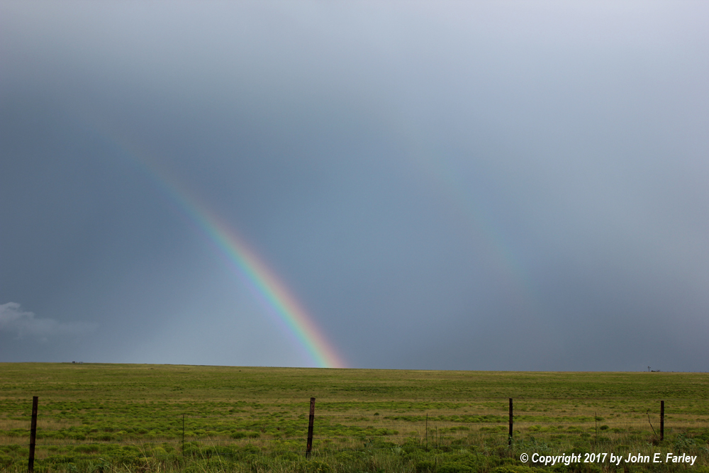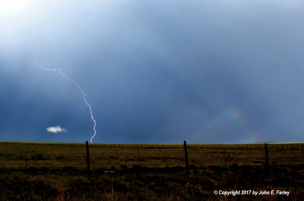 It looked like it extended to or very close to the ground, but note that the large scuddy cloud mass was not attached to the base of the parent cloud above it. Also, there was no indication of any rotation on radar in this area. So, just an interesting cloud feature. As the two storms merged just to the southeast of Gladstone, a SVR warning for what was now my Storm 4 was issued at 5:41 p.m., valid until 6:30. I continued south on NM 453 toward the storm, which continued to drift SE but seemed to be weakening a little by a little before 6. As I cut west on U.S. 56 and 412, the storm regained strength, and I turned south on NM 120 and went about 4 or 5 miles. There I watched as the storm produced a nice rainbow and a fair amount of lightning in the precipitation core, which was by now (around 6 p.m.) to my southeast, indicated by radar just after 6 p.m. as 13 miles north of Boyeros, which looked about right. I managed to get a nice rainbow shot and a couple shots of lightning and a rainbow both in the same picture: