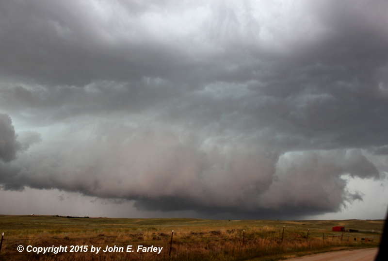 4:00-4:30 - I get into the notch of the HP supercell that had been TOR warned and which produced the brief tornado south of Kiowa an hour or so earlier. It is embeeded in a line of storms and is SVR warned now, with a 2-inch hail marker on GR3. These two pictures were taken from just NW of Ramah around 4:15: