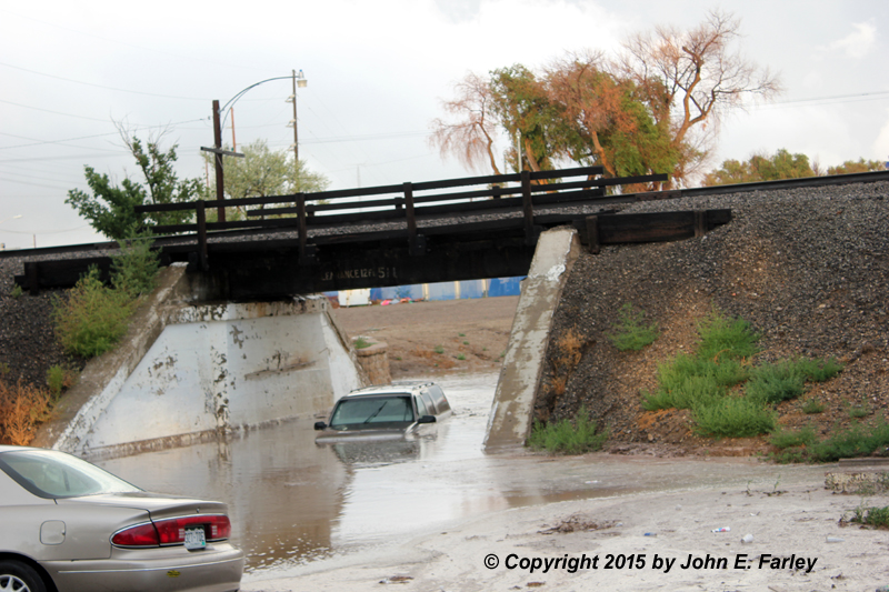 "Do not drive into water of unknown depth." A few blocks north, the westbound lanes of route 50 were also closed due to flooding under the same train tracks.