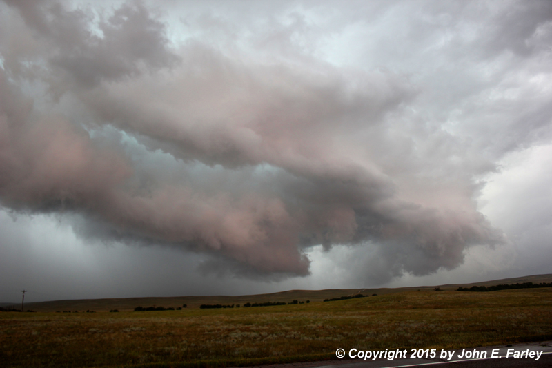 I manage to stay in the notch from N of Ramah through Simla to Matheson. At 4:20, 2.5 inch hail is reported in Peyton - a post-chase radar review shows that this occurred from the next cell down the line, which was rapidly intensifying around this time. Probably some decent hail in the storm I was on, too though. This picture was taken from near Simla a little after 4:20: