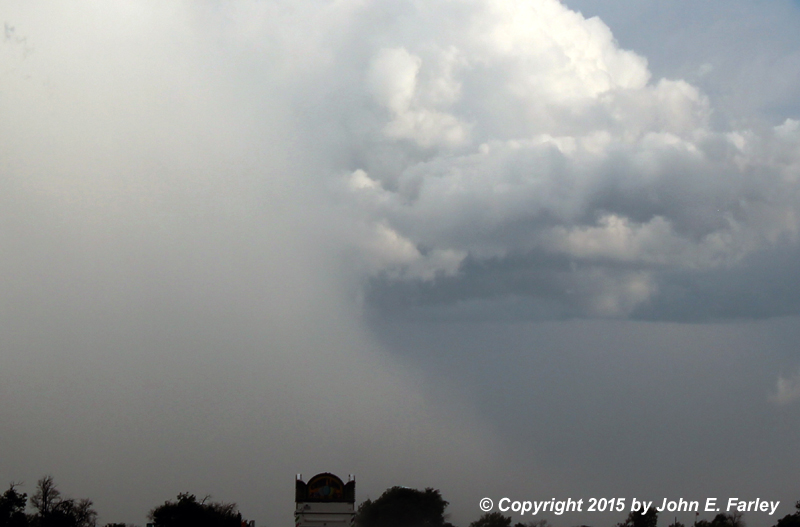 Here is a cropped/zoomed version of the same picture. Note what may be a narrow, sunlit funnel above/to the right of the wrapping precipitation, above the right edge of the truck in front of me. A little more of this had been visible just before I took this picture, but it was already disappearing behind the wrapping precip by the time I could grab my camera.