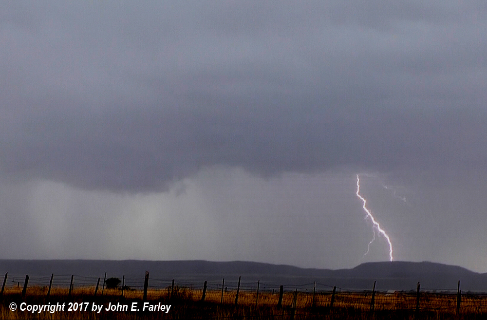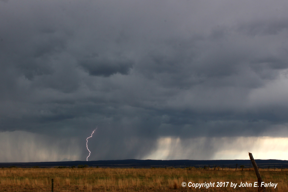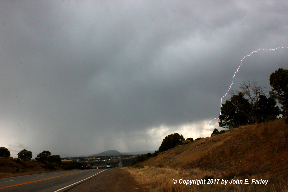 The first storm I encountered was moving into the eastern part of the Durango area, from the SSW to the NNE. The storm was not severe, but did produce quite a bit of lightning, heavy rain, and probably some small hail. I caught this bolt in the edge of the frame, looking west toward Durango from U.S. 160 around 2:10 p.m.: