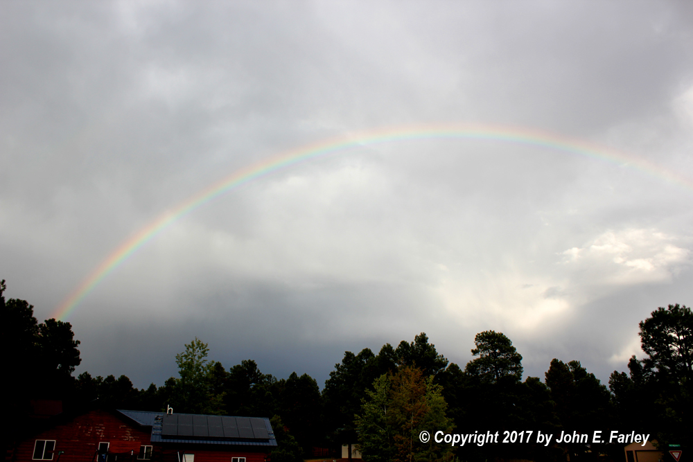 That was pretty much it for the chase, as I was now behind the fast-moving storms, which were in any case becoming more multi-cellular and linear and less intense. I was behind them all the way back to Pagosa, never really catching up to them, though getting in to the back-edge precipitation at times. I did have intermittent rainbows all the way back, and got this nice rainbow from my driveway just after getting home around 6:20: