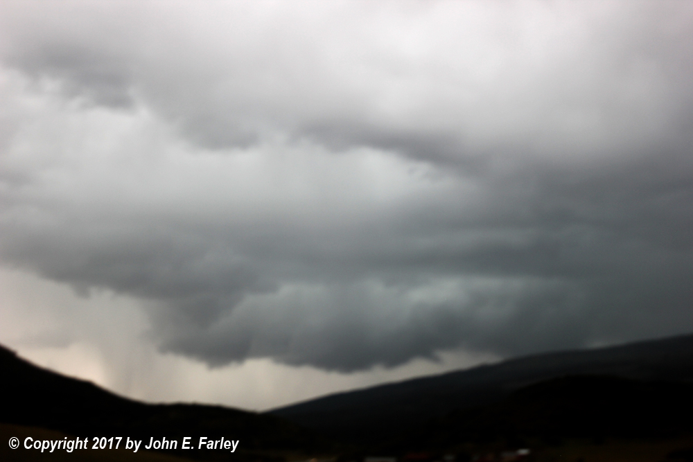 As I was losing the storm in the rain after a while, I headed back to Hesperus and west on 160 to re-intercept. But the fast moving storm disappeared into the mountains, and all I could catch was this blurry picture through the windshield of the now well-developed wall cloud: