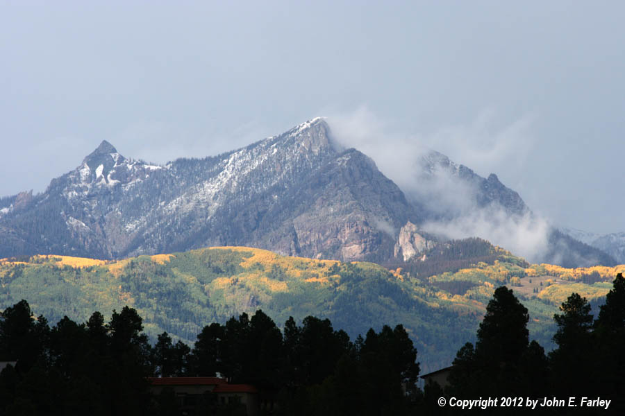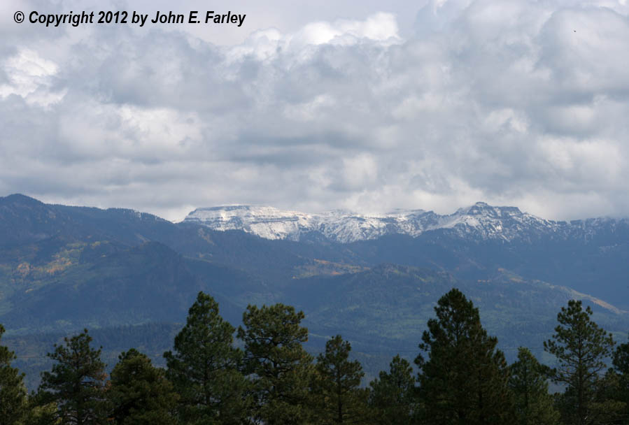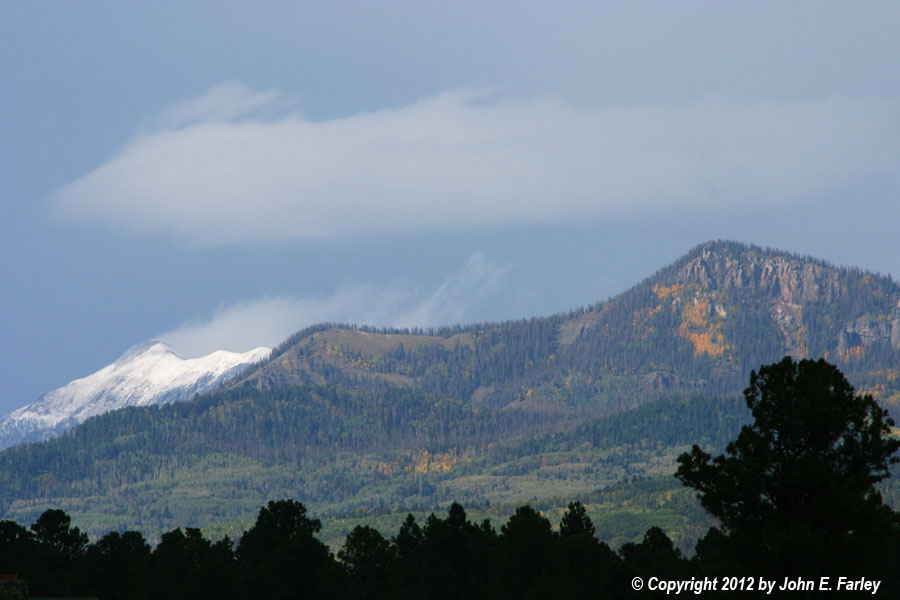 This snow fell overnight the previous night, in the highest elevations of the San Juan Mountains southeast of Pagosa Springs, between Wolf Creek Pass and Chama, NM. The snow became visible in the mid-day sun as the clouds cleared enough to reveal the mountains. You can also see some of the fall foliage from the aspens in the middle elevations of the mountains, although this shows up better in some of the pictures below after the afternoon storm.