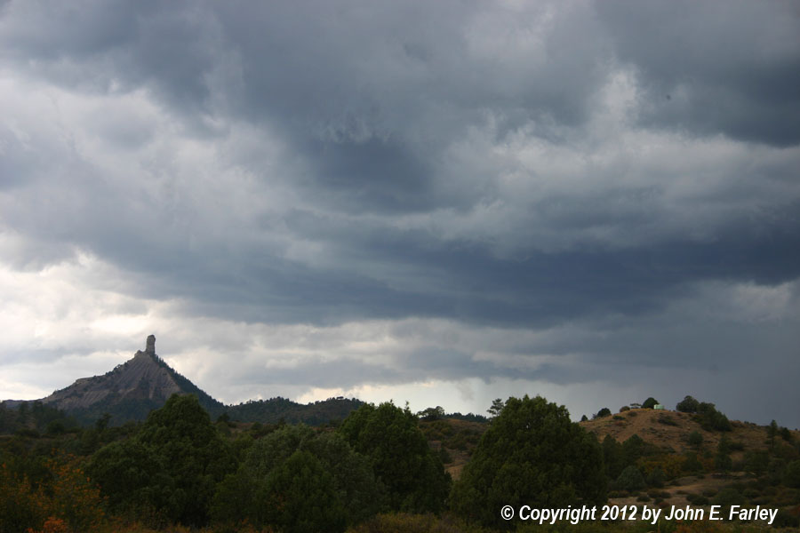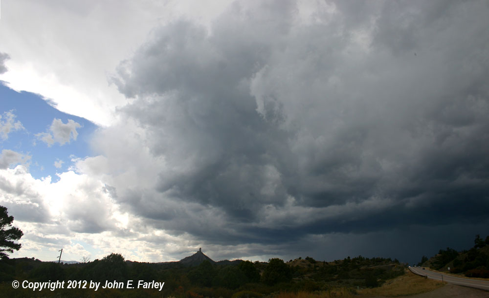 Around 2:30 p.m., I was heading out for more pictures when I noticed a strong storm off to the west, approaching Chimney Rock. (Note: Chimney Rock, a place of both geological and archeological significance about 20 miles southwest of Pagosa Springs, was designated last week by President Obama as America's newest National Monument. It also turns out to be a good place for weather photography, when the storm is in just the right place.) I decided to head west on U.S. 160 toward Chimney Rock to intercept the storm. As I got within five or six miles of Chimney Rock, the storm was looking good:
