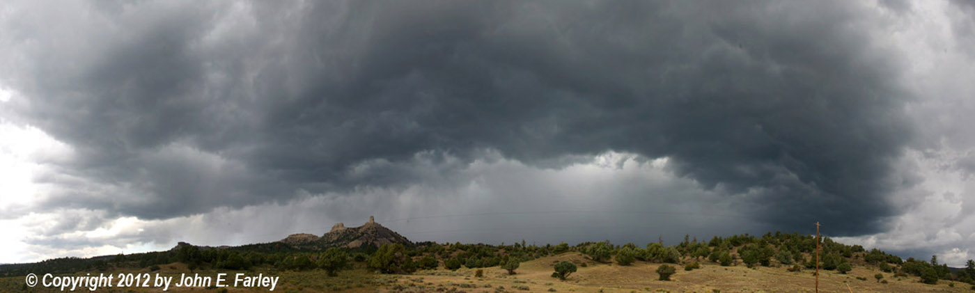 When I reached the turnoff to the south from route 160 for Chimney Rock, the core of the storm was crossing route 160 a few miles to the west. I thought about heading into the core to see what mix of precipitation was falling, but decided instead to see what photo ops I could get at Chimney Rock with the storm in the background. I'm glad I chose this option, because although the storm was now rapidly becoming more outflow-dominant, the photo ops were good. Here is a panorama stitch of four photos, showing Chimney Rock in the foreground and the storm in the background: