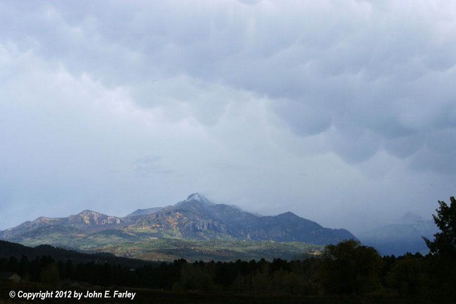 As the precipitation lightened, I could see that I was behind the storm and would have no chance of catching up, and noticed new storms off to the southwest somewhere near Chimney Rock again. I headed back down to route 160 and turned west, but didn't go far since by the time I could see Chimney Rock again I could also see that the storms were passing south of there, and I would have no chance to itercept them heading that way. So I turned back, and I am glad I did, because by then the initial storm had cleared the high mountains north and northeast of Pagosa Springs, revealing this combination of mammatus, fresh snow on the highest peaks, and fall foliage in the middle levels: