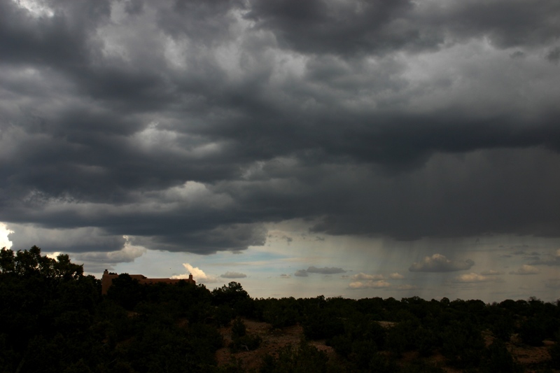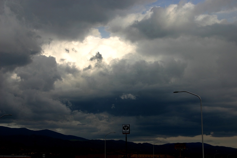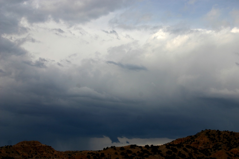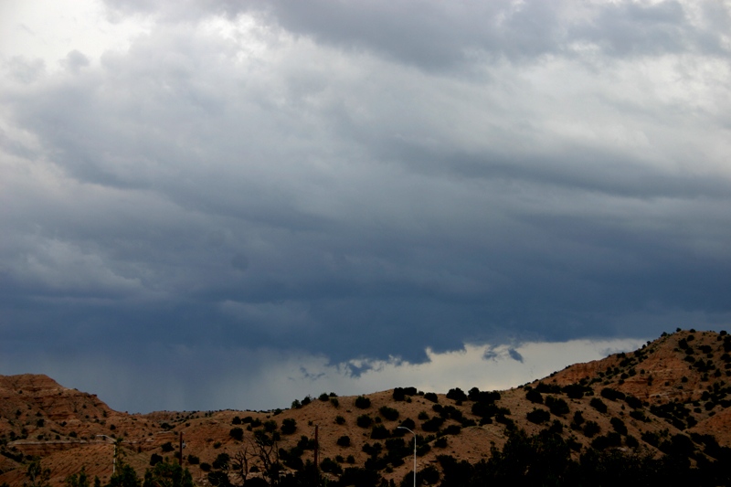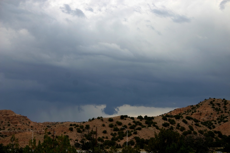 Although it was under an updraft and had something of a wall cloud look to it, I think a "scud bomb" would be a better characterization, as the convection remained weak and high-based, as can be seen in this picture, taken from near the Buffalo Thunder Resort, a few miles north, 5 or 10 minutes later. Also, there was little or no thunder and lighting with this activity, even though it was obviously convective in nature.