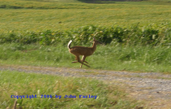 While watching a storm in Southern Illinois in September, 2006, I noticed this deer across the road from me. When I lowered my window to photograph it, it ran, allowing me the opportunity for this photo.