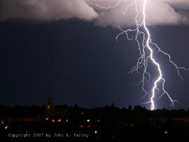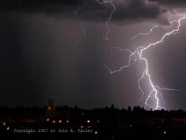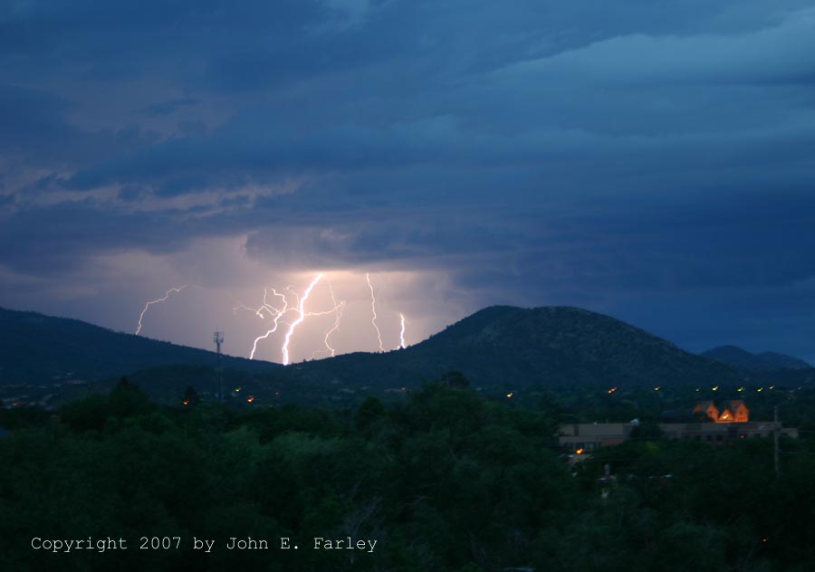 On August 5, 2007, I was fortunate to observe a spectacular lightning display in Santa Fe, NM as a monsoon thunderstorm approached the city from the south. I photographed the bolts above looking south from a hill in the northern part of the city, toward the Bataan Memorial in downtown Santa Fe. More pics are below - Click any thumbnail below to see a full-size image.