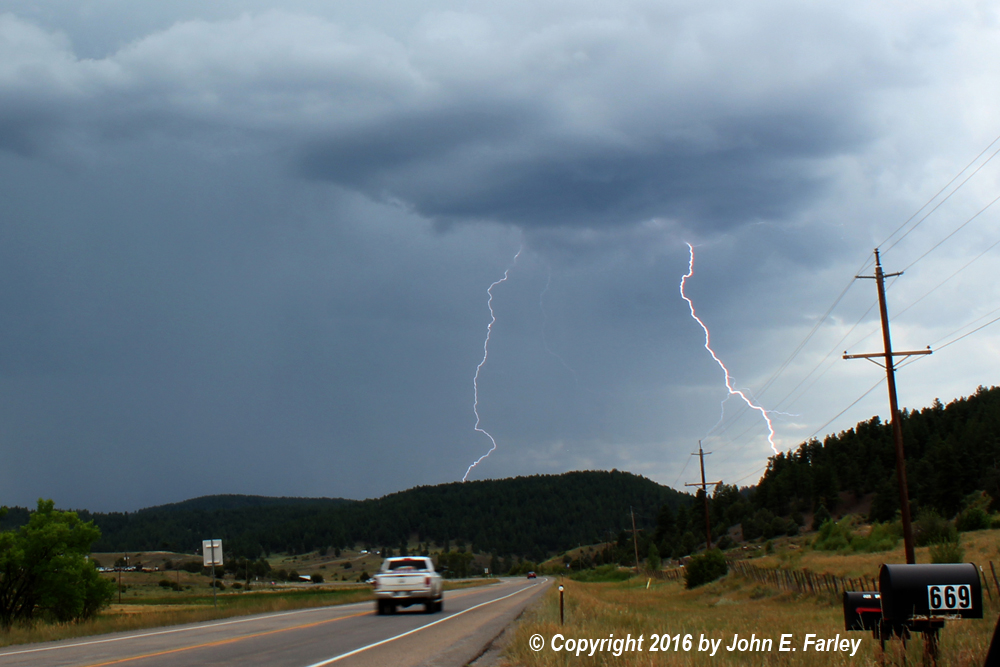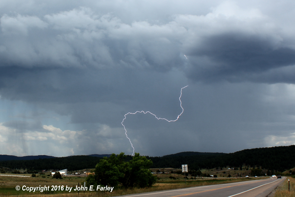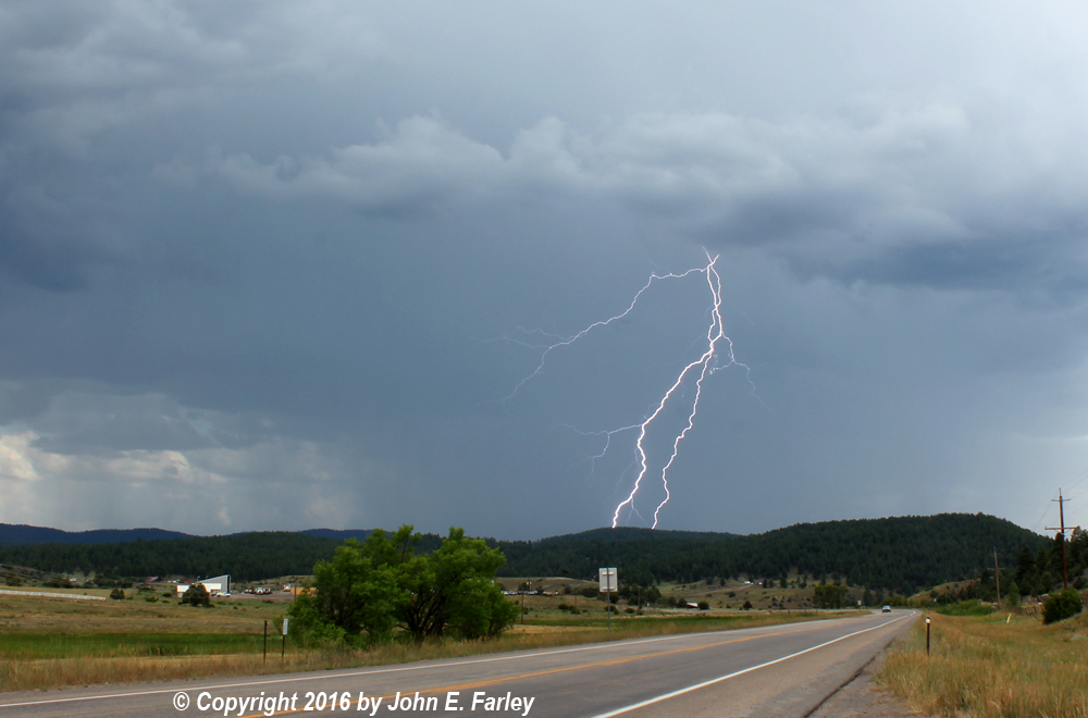 As moist monsoonal flow returned to southwest Colorado, several thunderstorms developed near Pagosa Springs. This one formed south of town, as I watched from along U.S. 84 about 2 miles southeast of Pagosa Springs. It became quite intense for a while before backbuilding and drifting off to the southwest into northern New Mexico. It produced localized very heavy rain, enough to cause small rock and mud slides across Blanco River Road, a few miles down the highway from where I viewed the storm. And it also offered me some nice lightning photo ops. These were taken using a lightning trigger, the best way to capture daytime lightning.