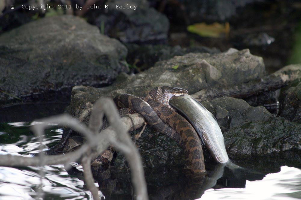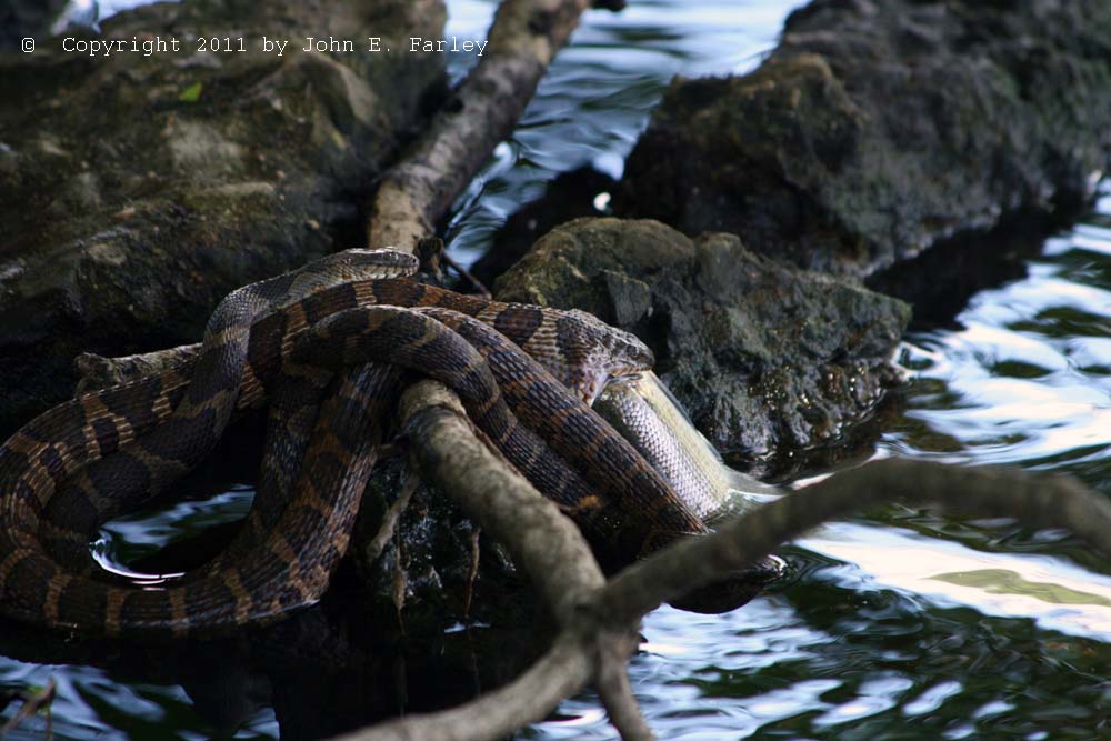 On shore now. Notice the second snake doing guard duty while the first one tries to swallow the large fish.