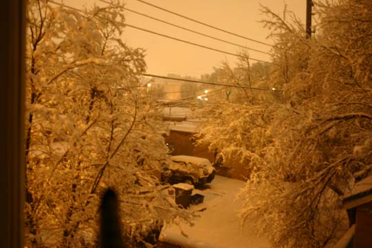 In the early afternoon, skies partially cleared for a while, but by 3:30 another band of snow began to approach the Santa Fe area. This band intensified as it moved over the city, resulting in thundersnow. I heard at least 3 rumbles of thunder, one of which was quite abrupt and loud and likely indicated a cloud-to-ground (CG) strike. Indeed, the lightning detector maps indicated several strikes in the general area around Santa Fe. At the height of this burst of snow, visibility was down to only a block or two. This round of snow lasted only about 40 minutes, but in that time it produced a little more than a half inch of additional snow, which quickly slickened area roads. As the temperature dropped quickly after sunset, many parts of town experienced severe icing of streets and sidewalks.