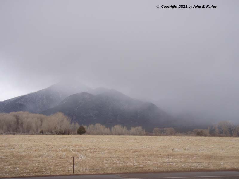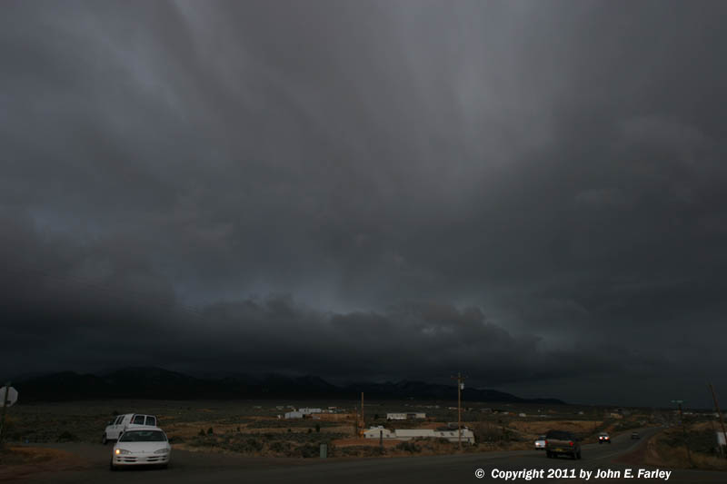 Around this time, I noticed that the snowshower I had seen earlier to my northwest when I was on my way to Taos had now intensified quite a bit. So I decided to double back through Taos toward the southwest, and after I got through town, I was greeted with this: