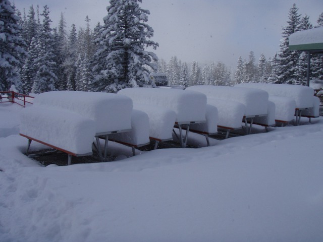 A chairlift that was not in use. Note the snow accumulated above the backs of the seats!
