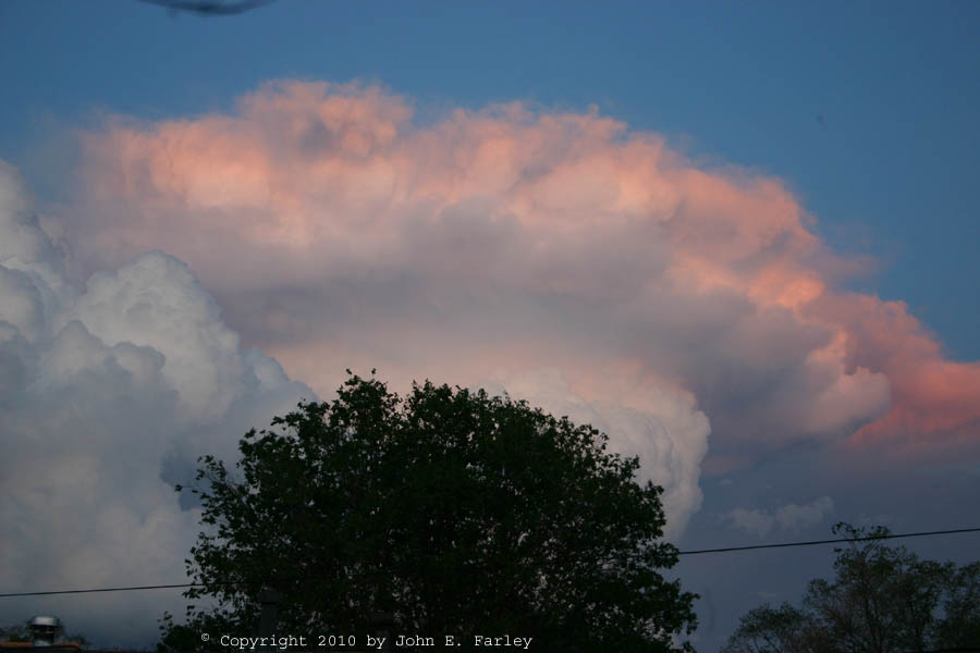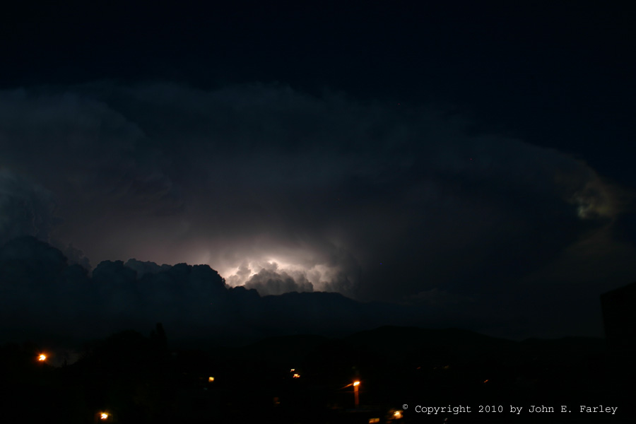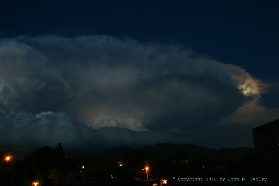 This storm was SVR-warned for hail, but due to its location in rugged, mountainous, thinly-populated terrain, I saw no reports of severe weather - probably very few if any people live where the hail fell. Earlier another storm 25 miles or so SE of this one produced copious amounts of quarter to golfball hail in an area from near Las Vegas down to Villanueva. Several cars reported off I-25 due to 2-3 inch hail accumulations.