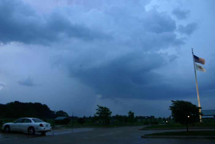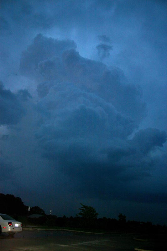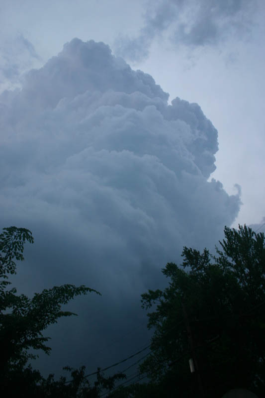 Although tornado watches were in effect for the Missouri part of the St. Louis area until 1:00 a.m. and the Illinois part until 3:00 a.m., relatively little severe weather occurred on June 10. There was decent instability and some diretional shear, and a slow-moving warm front and some old outflow boundaries from earlier storms provided the focus for storm development. But the wind shear was relatively weak, and the high amount of moisture in the air led to numerous storms rather than one dominant one, so that many storms were rather quickly weakened by other nearby storms. An isolated storm developed right over Edwardsville around dinnertime, and slowly drifted east and intensified, putting out a fair bit of lightning after a while. When the storm was just a mile or two east of ny house, the updraft was pretty impressive: