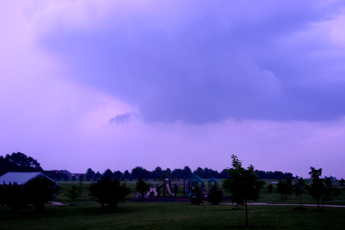 Here is another picture taken 15 or 20 minutes later from nearby Glik Park in Edwardsville. Early on, this storm was quite isolated, and it even tried to form a couple small, brief lowerings under the updraft, like this and this. But a large cluster of storms soon formed to the south of this storm in St. Clair County, and these storms seeded the Edwardsville one and caused it to weaken. The storms to the south and west soon led to SVR warnings for virtually every county in the St. Louis metropolitan area except Madison, but mostly produced pea-sized hail and very heavy rain.