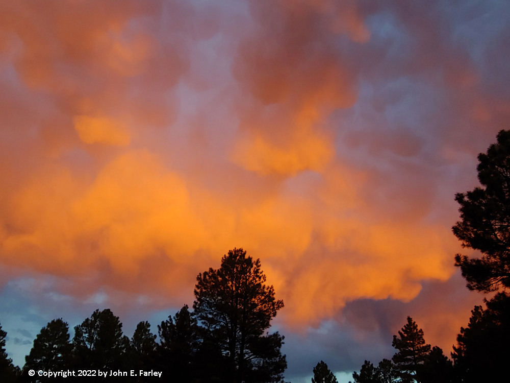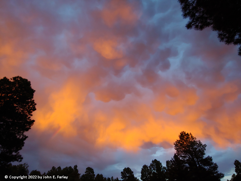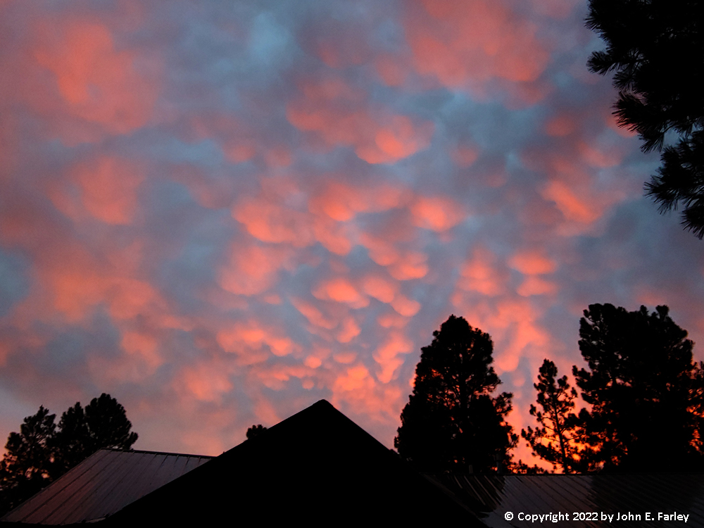 The 2022 Southwest Monsoon had an exceptionally early and strong start. In fact, an article in the Albuquerque Journal on June 22 quoted a meteorologist saying that since record-keeping began in 1905, this is the earliest that there has ever been a monsoon onset of this intensity in New Mexico. Very much needed, given the extreme drought in much of the Four Corners states. In Pagosa Springs, CO, we had close to an inch and a half of rain in the week between June 16 and 23, bringing us well above the usual June total of under an inch - and more is likely on the way before June is over. The attached pictures are of sunlit mammatus after a rather light (compared to several other recent storms) thundershower passed over our house the evening of June 23.