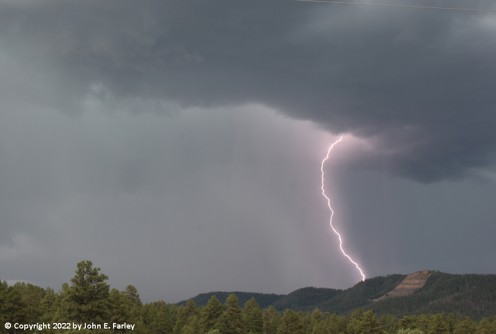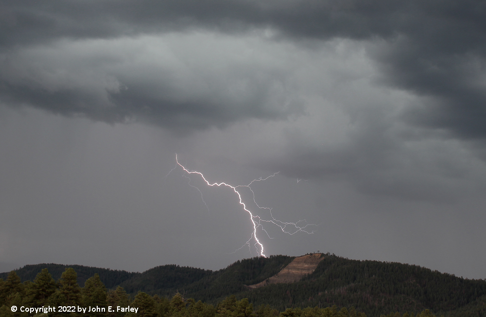 I decided to head south on S. Pagosa Blvd. past the hospital and jog over to Trujillo Road (CR 500) from where the pavement ends on S. Pagosa Blvd, to continue south on Trujillo Rd. I figured this would bring me close to or just west of the track of the storm. As I passed the hospital, I saw a distant bolt of cloud-to-ground (CG) lightning, which gave me hope. I continued south on Trujillo Road to a mile or two north of the Acrhculeta County landfill, watching the storms as they moved over the Archuleta and Montezuma Mesas and Bridge Timber Mountain, to my south and southeast. I set up my camera with the lightning trigger, and over the course of my watching the storms, it triggered more than 100 times. Many times the timing was off or the lightning was out of the frame, but I got somewhere in the range of 25 shots with some lighting in them, including several I am very happy with. By far my best lightning photography outing this year, and one of my better ones ever. Here are a few pictures of the lightning: