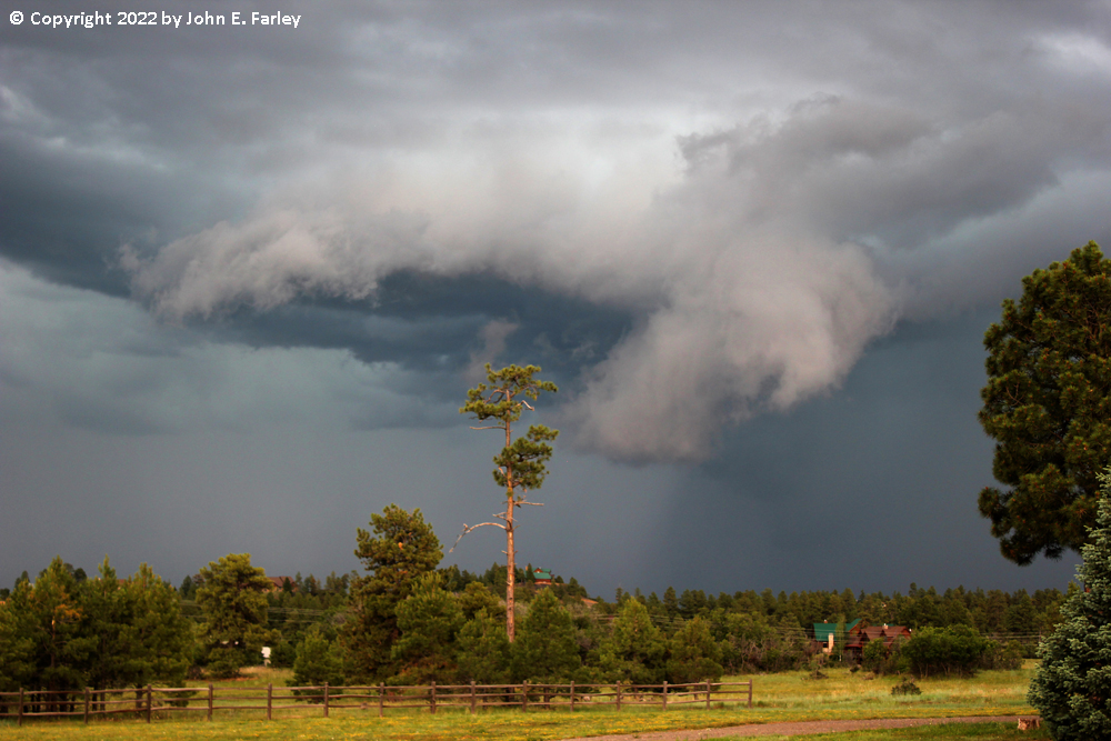 By somewhere around 6 p.m. or maybe a little after, there was darkening updraft base overhead and I knew I was in an increasingly dangerous spot lightning-wise, and also one where it would likely soon be raining hard, so I retreated back north to a spot just southeast of the Pagosa Springs Medical Center. As I neared this area, my phone alarmed for the third of the three special weather statements, and I was noticing a couple rather impressive lowerings that formed as the storm propagated north and reintensified. Here is a picture of one of those features: