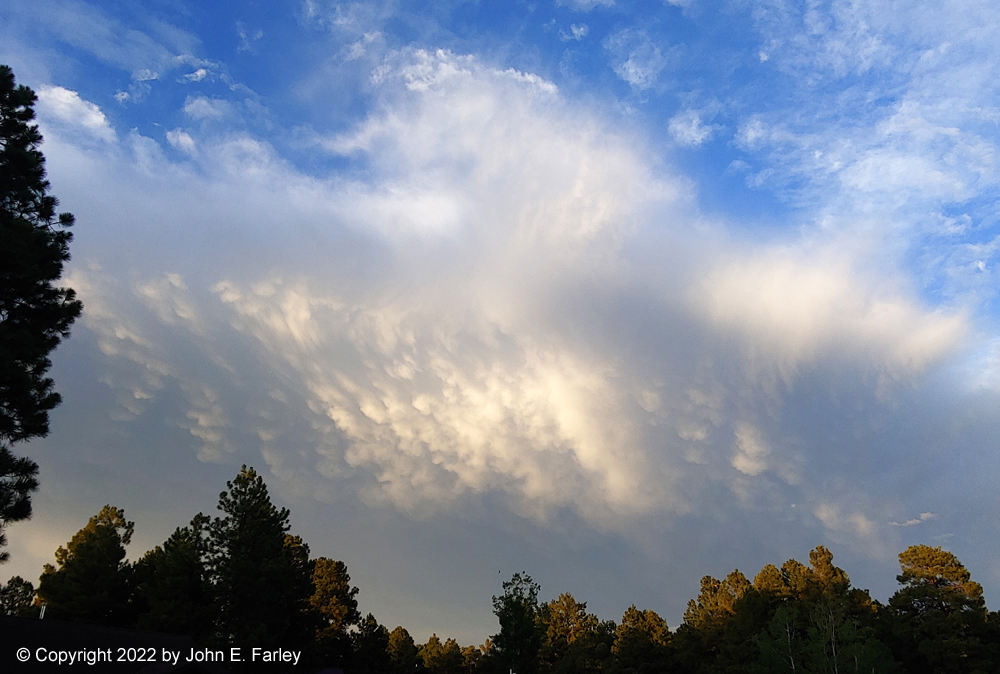Although Pagosa Springs was included in the special weather statement, when I got home not long after taking the last picture above, it did look to me on the radar like the storm would pass just southeast of Pagosa Springs, and that is pretty much what happened. We only got a little rain, but locations a few mies east and southeast of town got .5 to .7" inches of rain, and as I mentioned, around an inch near Wolf Creek Pass. As storms continued on northeast farther into the mountains, we got a nice, albeit somewhat distant, display of sunlit mammatus: