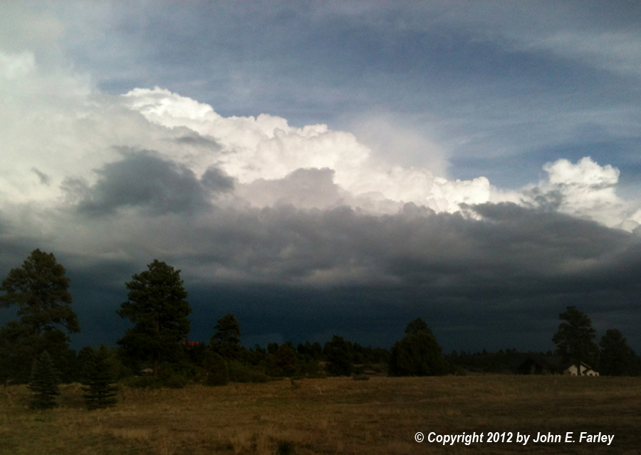 Nothing real out of the ordinary, but nice to see some kind of storm structure in a hot, dry year in which there hasn't been much. Below is a more zoomed shot showing the interaction of the storm's cloud-base features with the mountains: