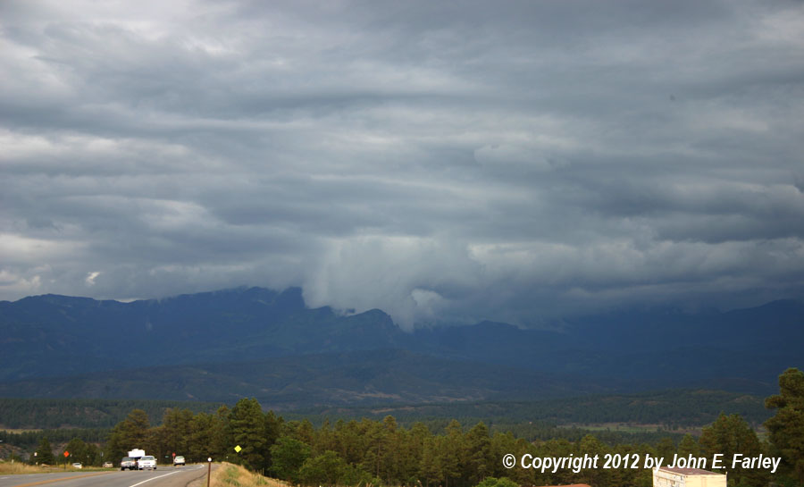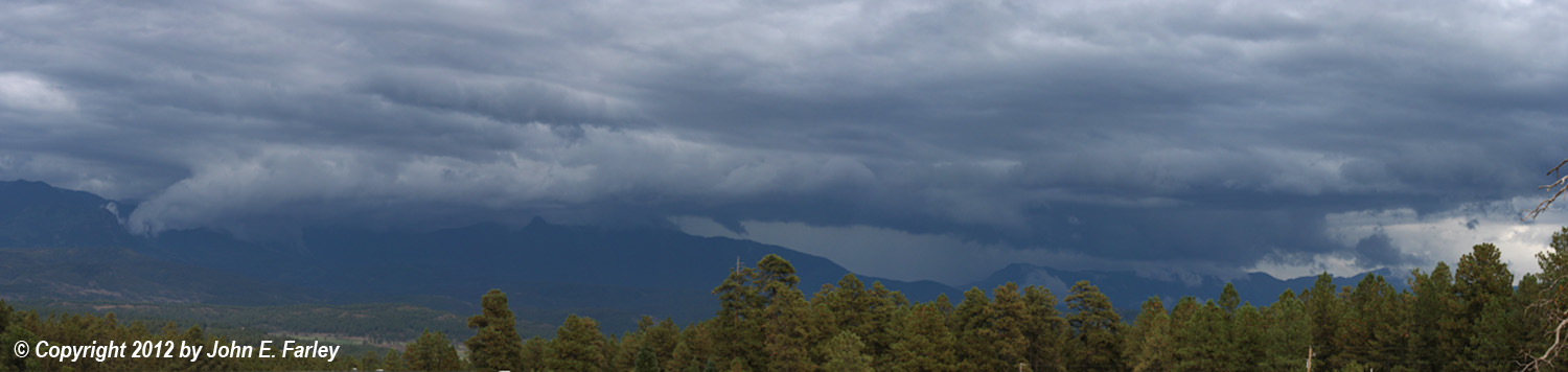 When I got home, I noticed that the tower above where I had seen the lowering was overshooting the rest of the storm's top by quite a bit, so after unloading a bunch of stuff I had in the car I grabbed better cameras and headed back toward where I could see the storm. By the time I got to a place with a good view, it was about a half hour after I took the picture above, and the storms had congealed into a line of heavy storms over the San Juan Mountains east of Pagosa Springs. Here is a panorama I stitched from six shots with the zoom lens: