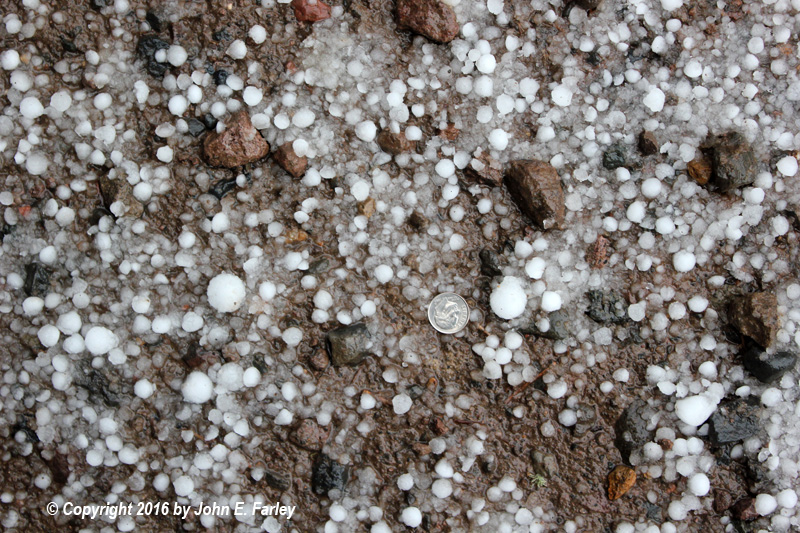I continued north into the higher country a few miles past the river crossing, and soon found the ground covered by up to dime-sized hail: